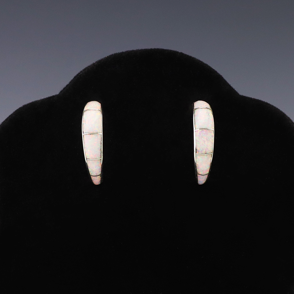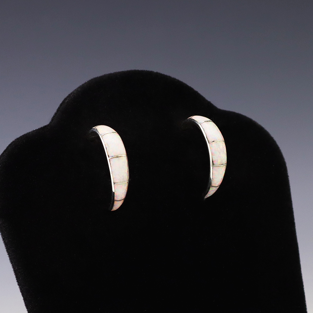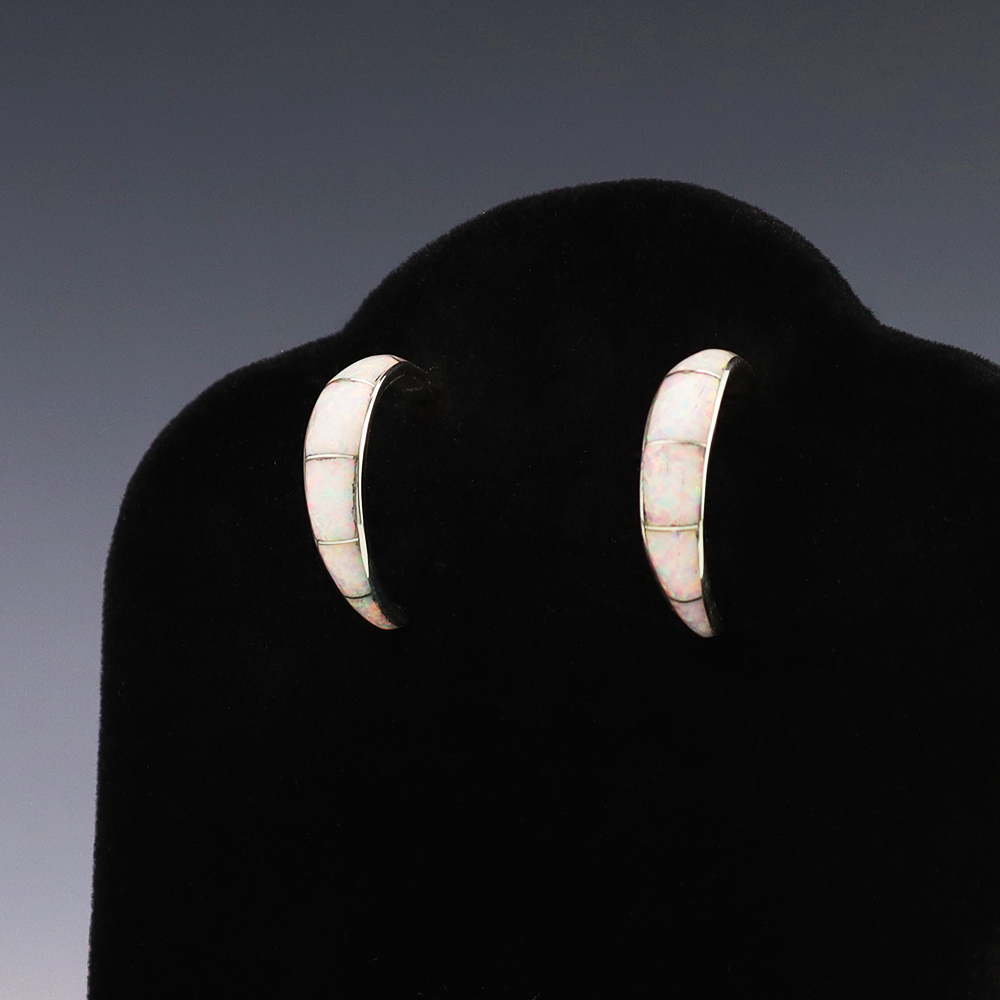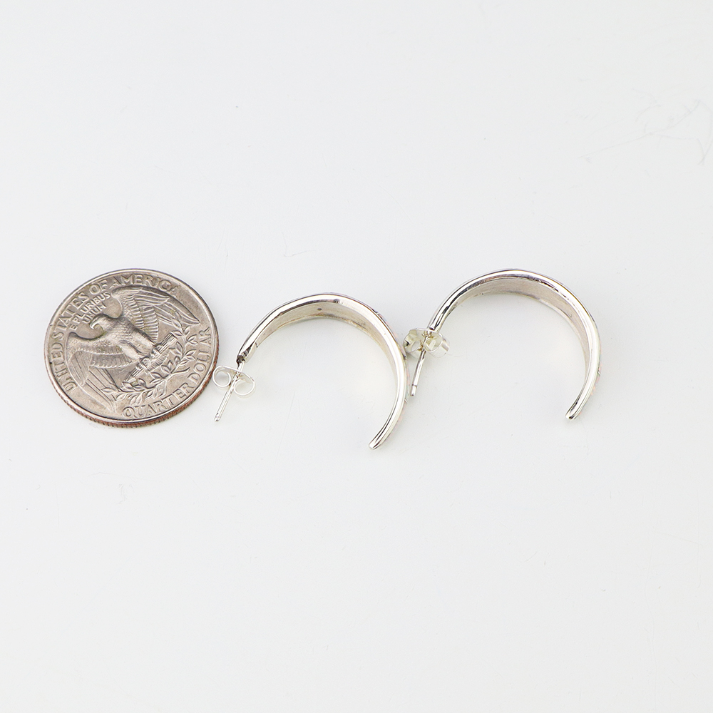Outstanding sterling silver earrings with Mother of Pearl Shell and Turquoise inlay. Hand crafted by Zuni jewelry makers, Nancy and Sheldon Westika. The Westikas have been making jewelry since the 1970’s and they are known for their fine inlay work. Weighs 6 grams. Signed 7/8” wide x 7/8” tall 1 ...