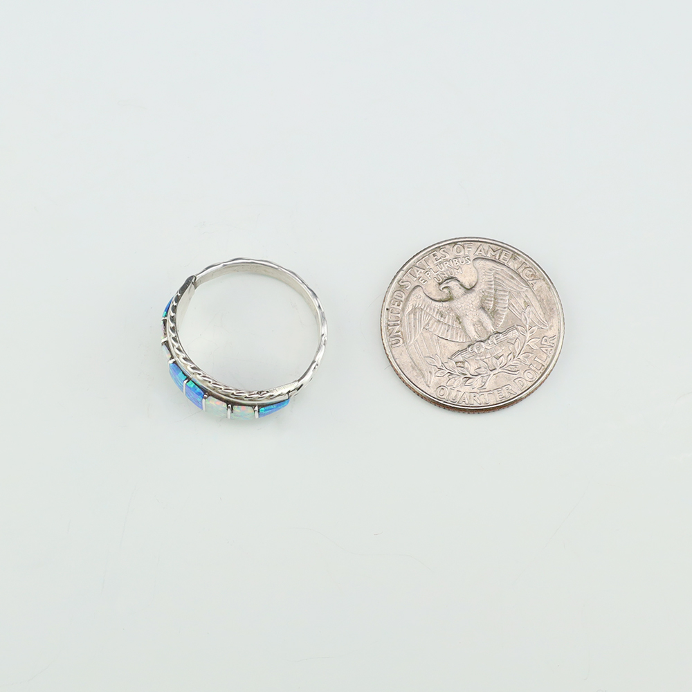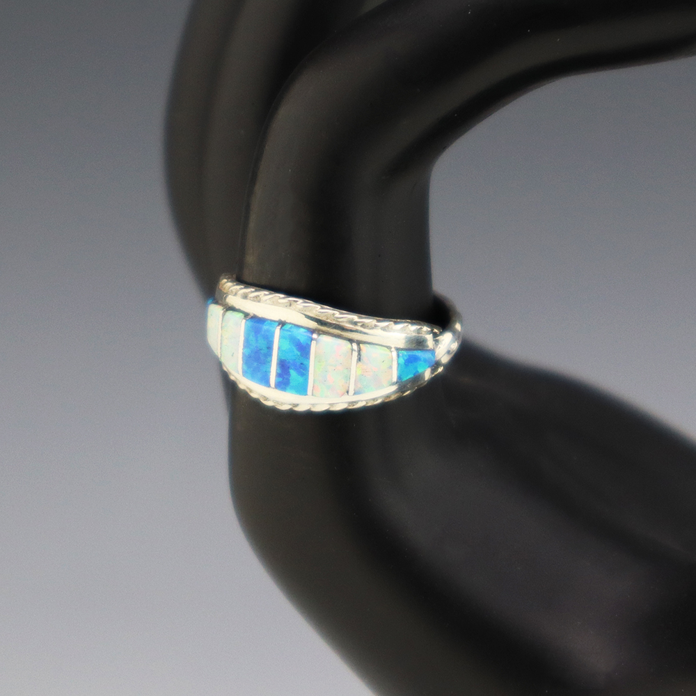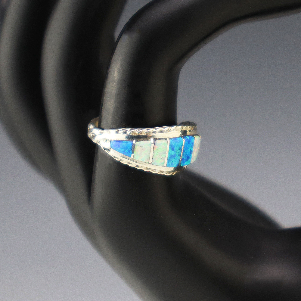 Zuni artists are known for their fine lapidary skills. Each stone is hand cut, polished, and inlaid into a sterling silver setting. The ring is set with Laboratory Opal stones. Hand made by Zuni artist Mirenda Peynetsa. Weighs 4 grams. Size 8 1/4. Signed