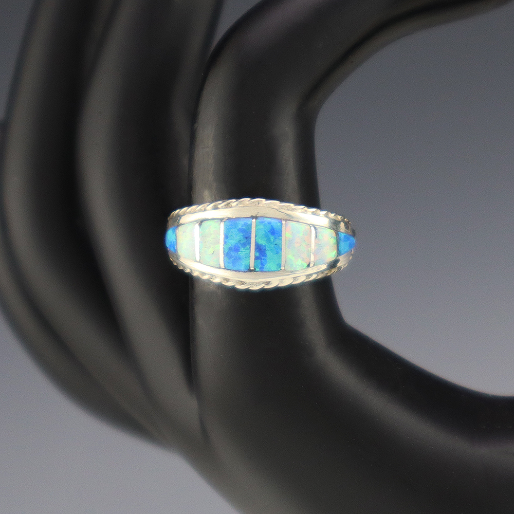Zuni artists are known for their fine lapidary skills. Each stone is hand cut, polished, and inlaid into a sterling silver setting. The ring is set with Laboratory Opal stones. Hand made by Zuni artist Mirenda Peynetsa. Weighs 4 grams. Size 8 1/4. Signed