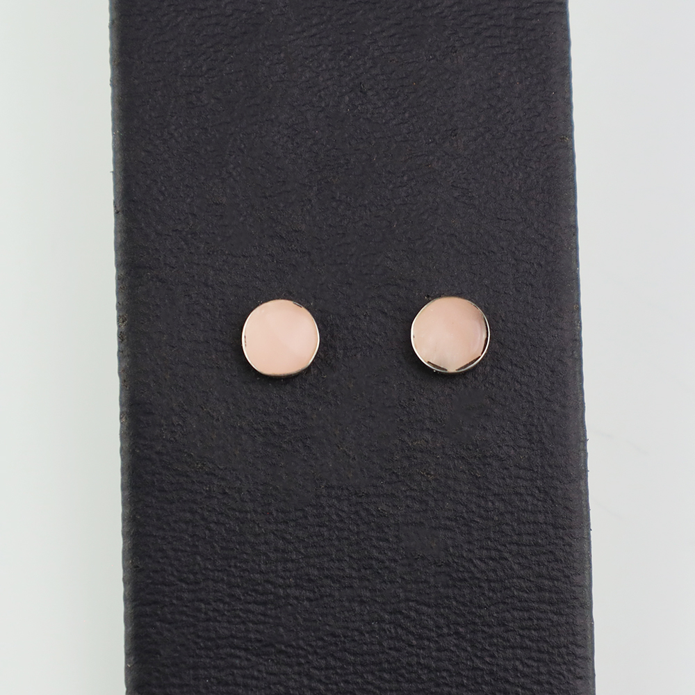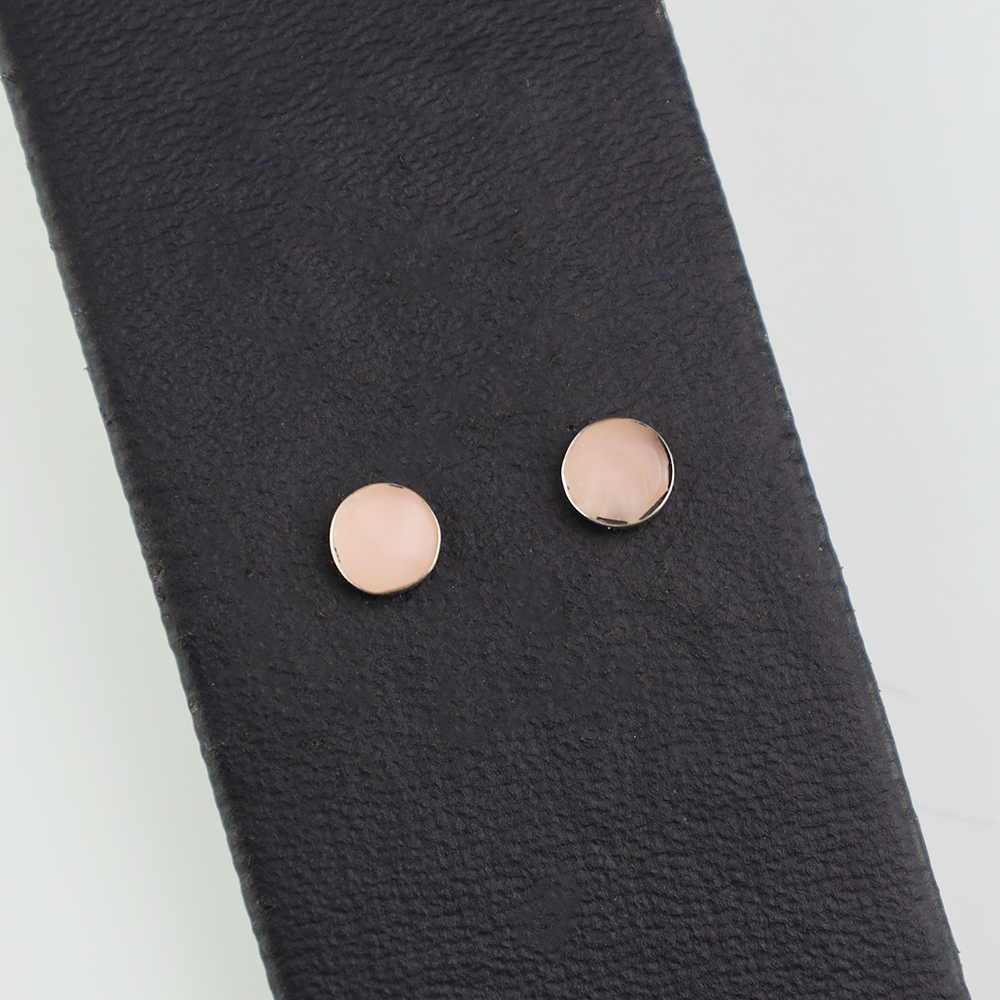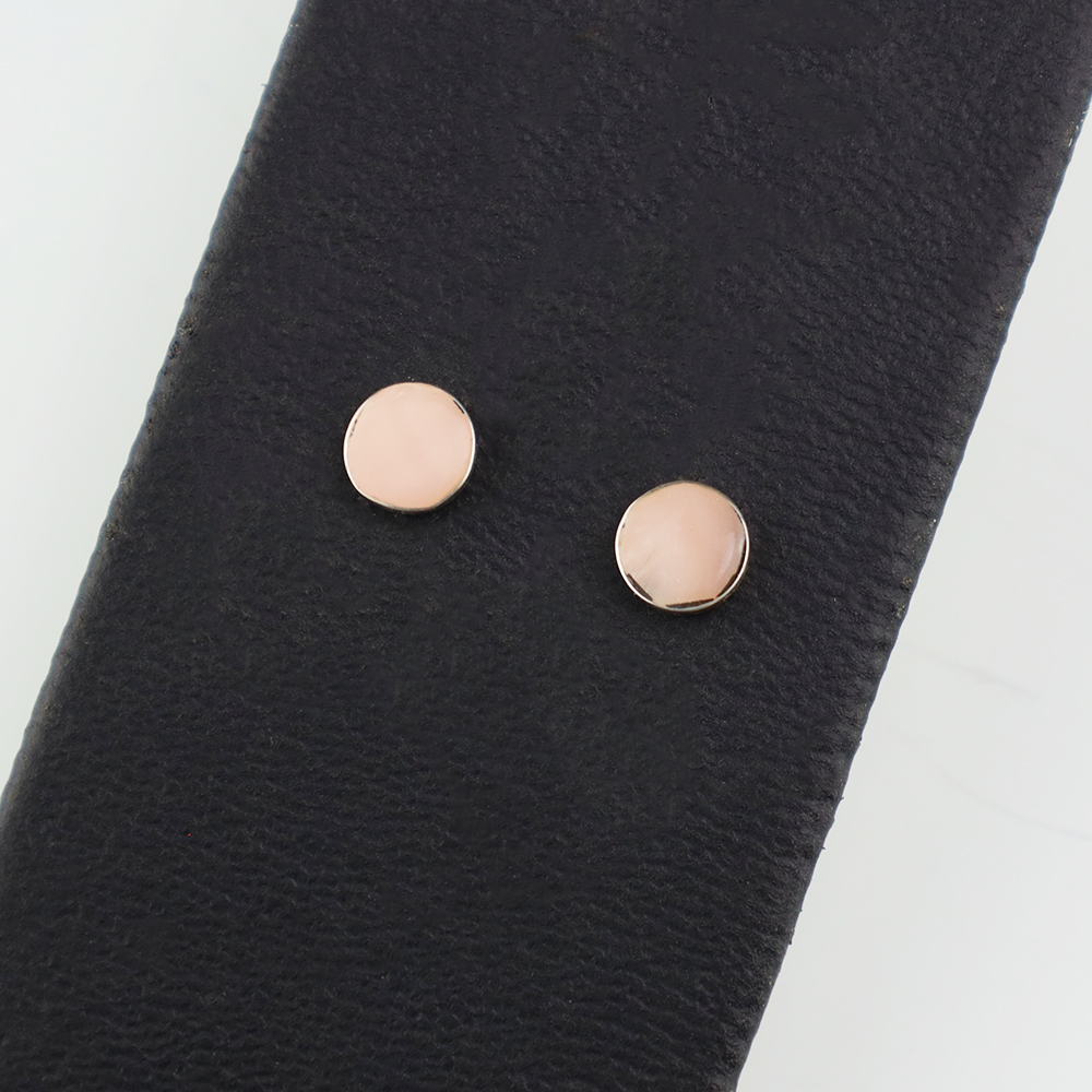 Each earring features Pink Mussel inlaid into a sterling silver setting. Hand made by Zuni jeweler Celena Rosetta. These gorgeous earrings will become a versatile accessory in your jewelry collection.