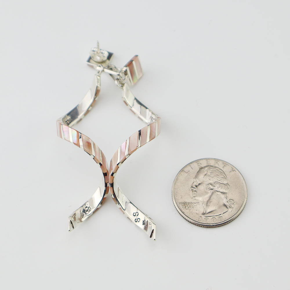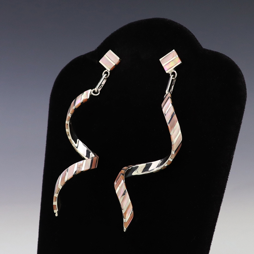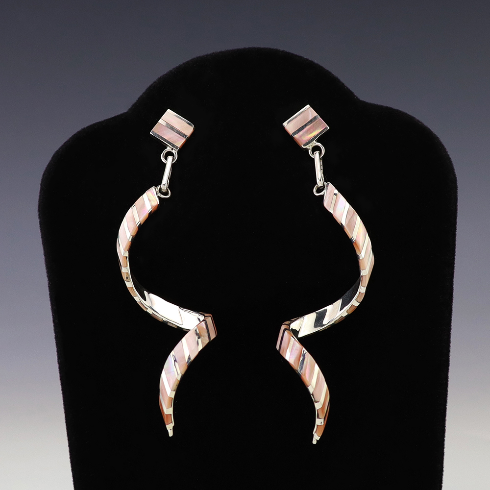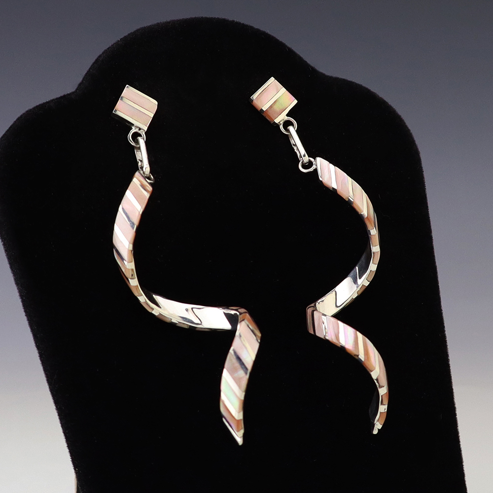Outstanding sterling silver earrings with Mother of Pearl Shell and Turquoise inlay. Hand crafted by Zuni jewelry makers, Nancy and Sheldon Westika. The Westikas have been making jewelry since the 1970’s and they are known for their fine inlay work. Weighs 6 grams. Signed 7/8” wide x 7/8” tall 1 ...