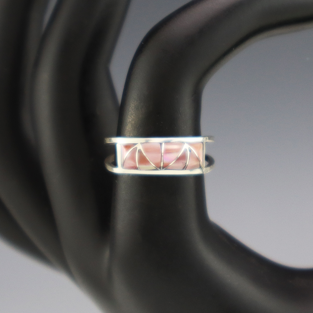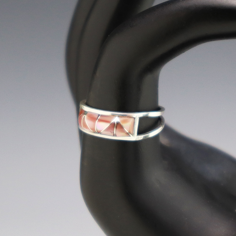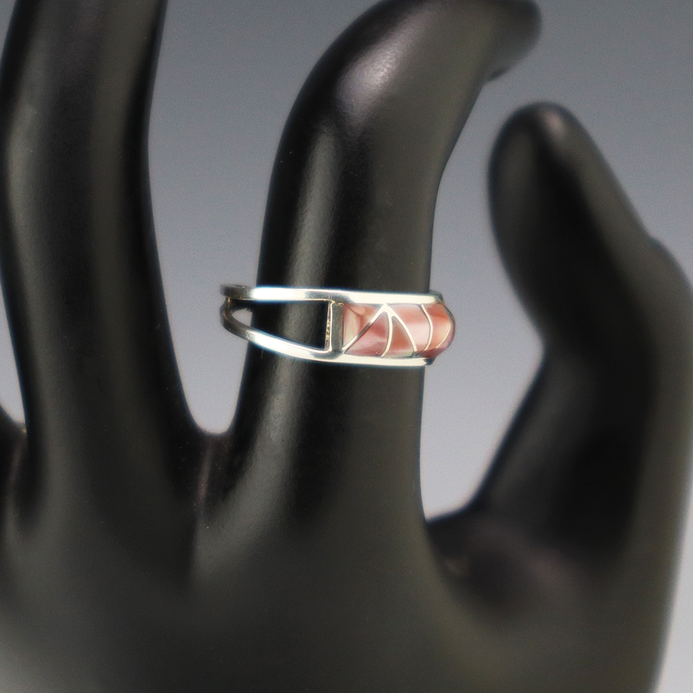 Zuni artists are known for their fine lapidary skills. Each stone is hand cut, polished, and set into a sterling silver setting. The ring is set with Pink Mussel stones. Hand made by Zuni artist Gloria Tucson. Weighs 2 grams. Size 7. Signed