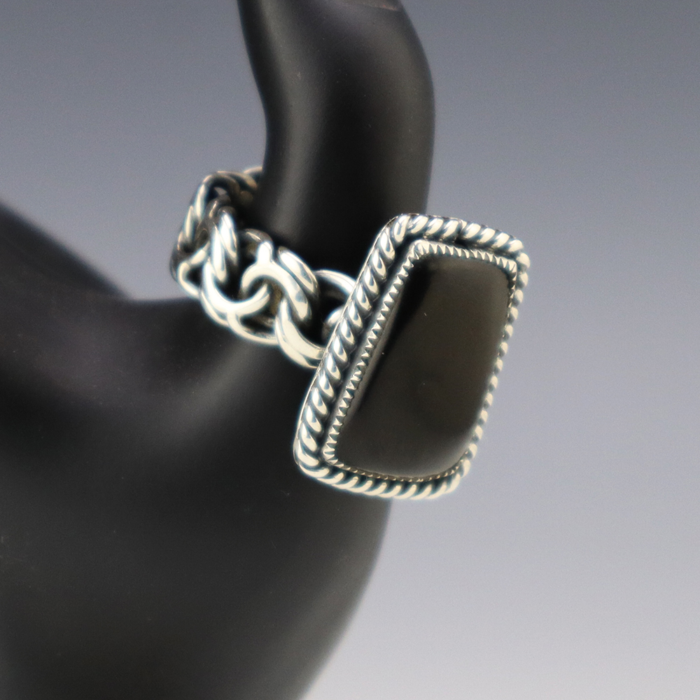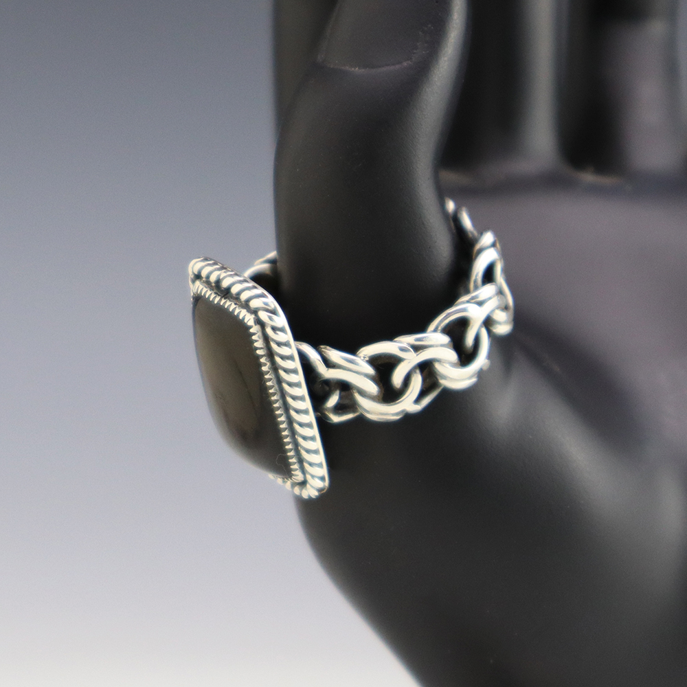 Amazing inlay work! Zuni jewelry makers, Nancy and Sheldon Westika created this magnificent ring. Made out of sterling silver and inlaid with Kingman Turquoise and Jet. Zuni artists are known for their lapidary work. The Westikas have been making jewelry since the 1970’s and they are known for their fine...
