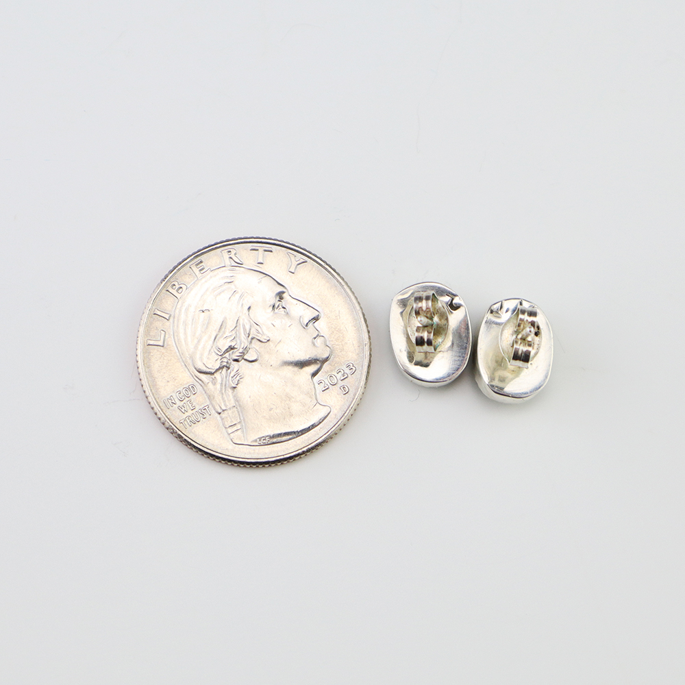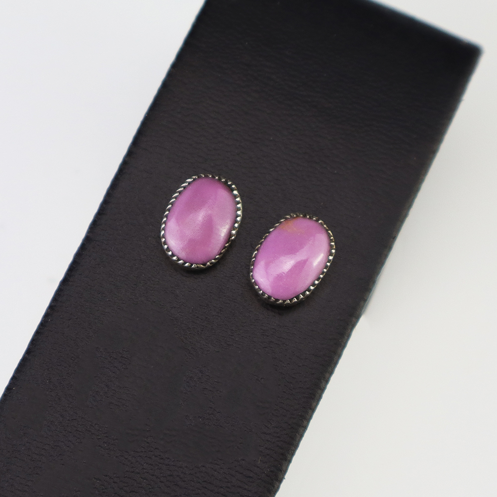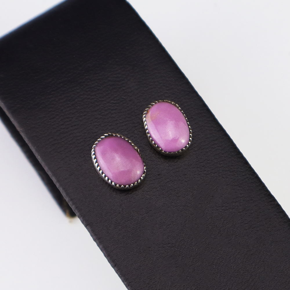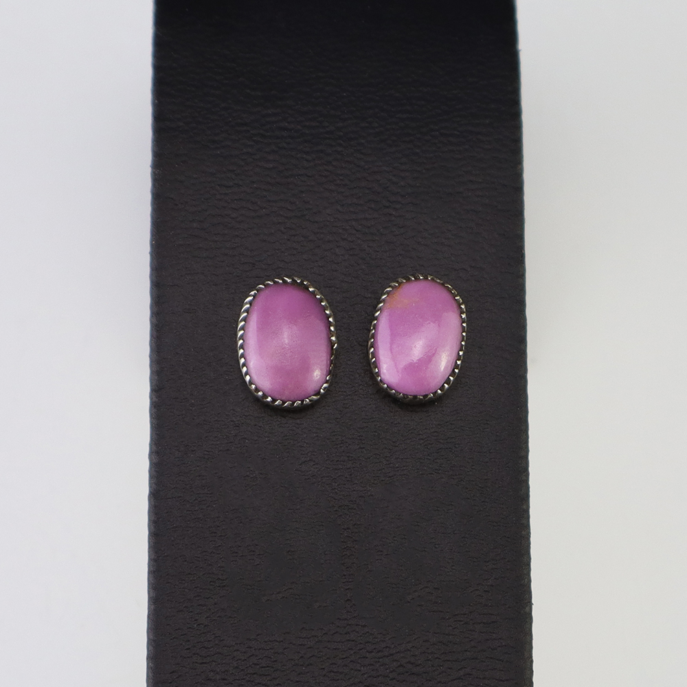 Zuni artist, Diane Lonjose created these lovely earrings. Made out of sterling silver and set with natural Stichtite. The components are all hand fabricated and the stones are all natural. Diane comes from a family of Zuni jewelers. She is the daughter of Alice and Duane Quam, and grandchild of Doris and Warren Ondelacy. Weighs 2 gram. Signed