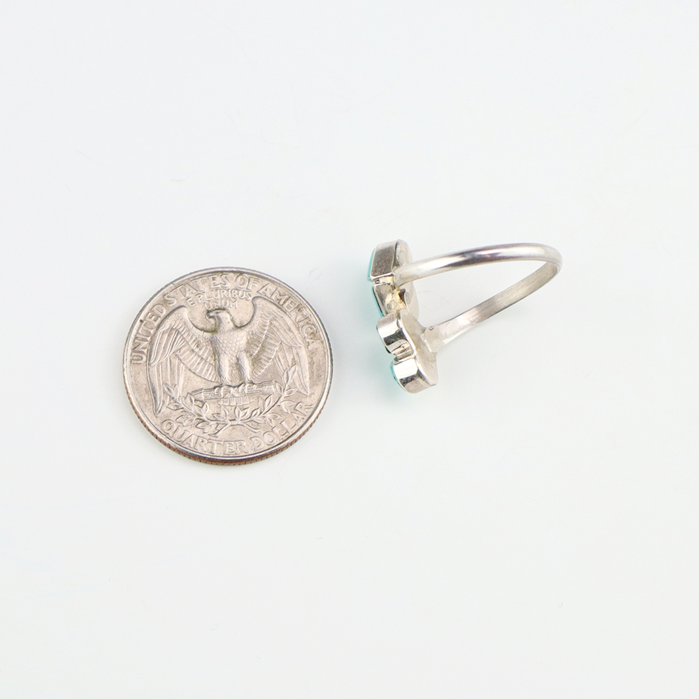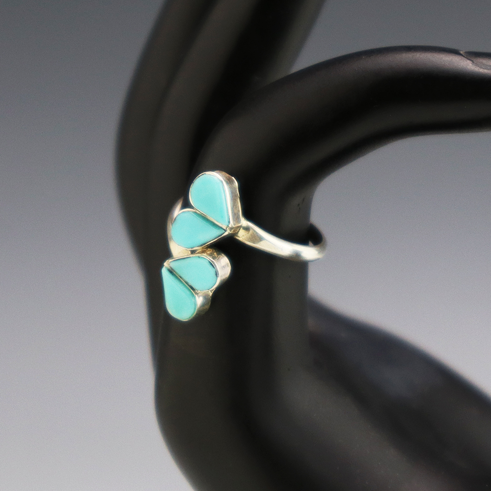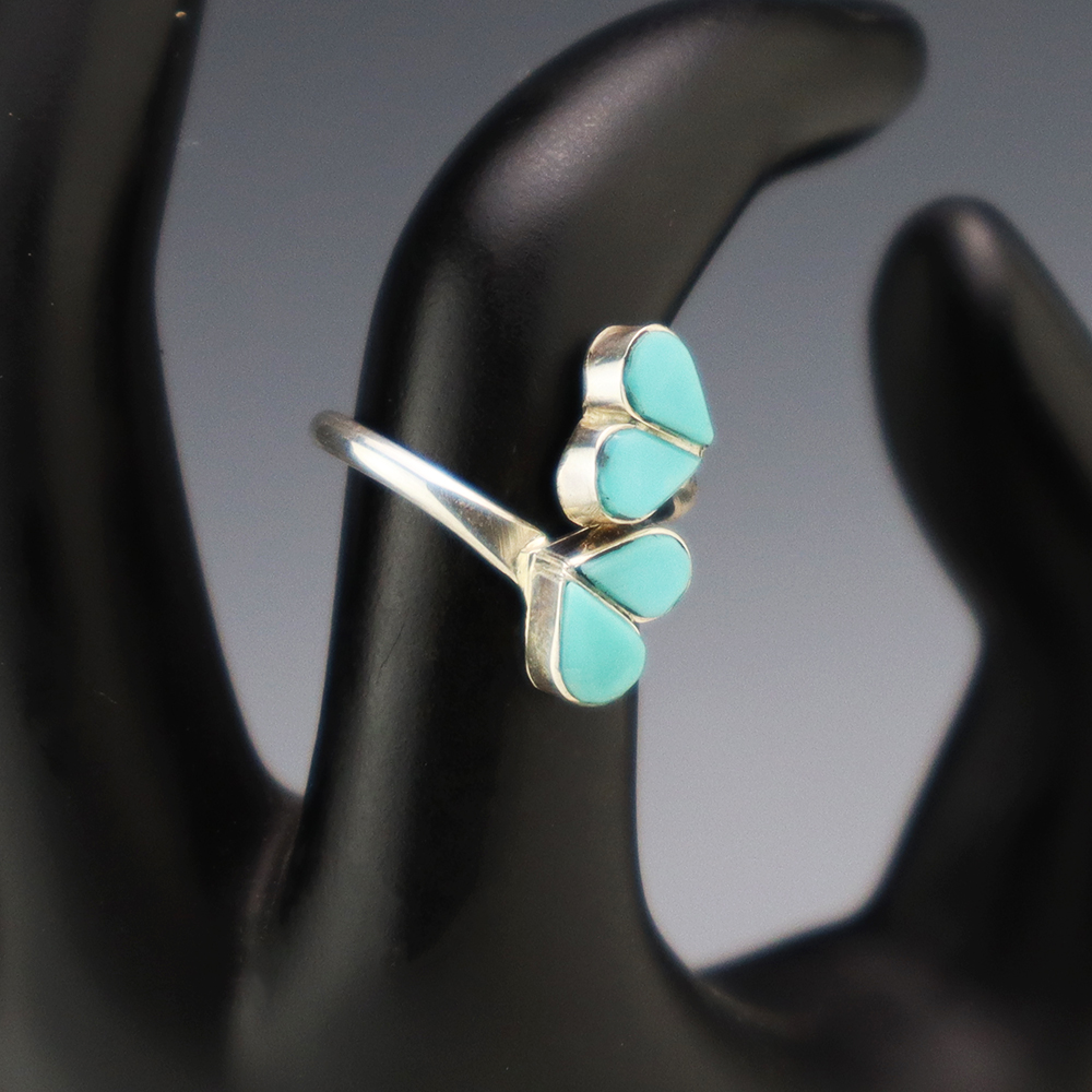 Zuni artists are known for their fine lapidary skills. Each stone is hand cut, polished, and set into a sterling silver setting. The ring is set with Turquoise stones. Weighs 2 grams. Size is adjustable.