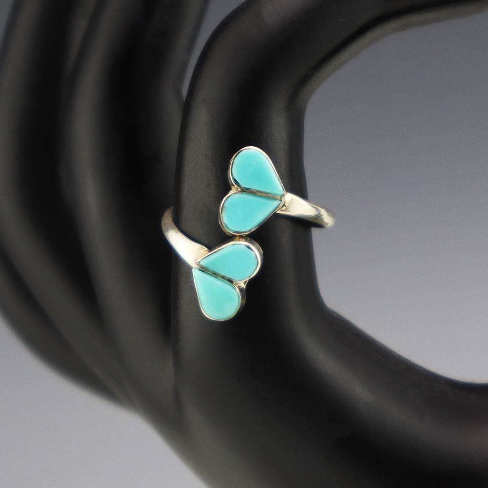 Zuni artists are known for their fine lapidary skills. Each stone is hand cut, polished, and set into a sterling silver setting. The ring is set with Turquoise stones. Weighs 2 grams. Size is adjustable.