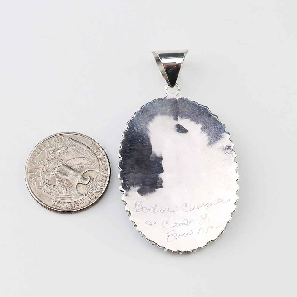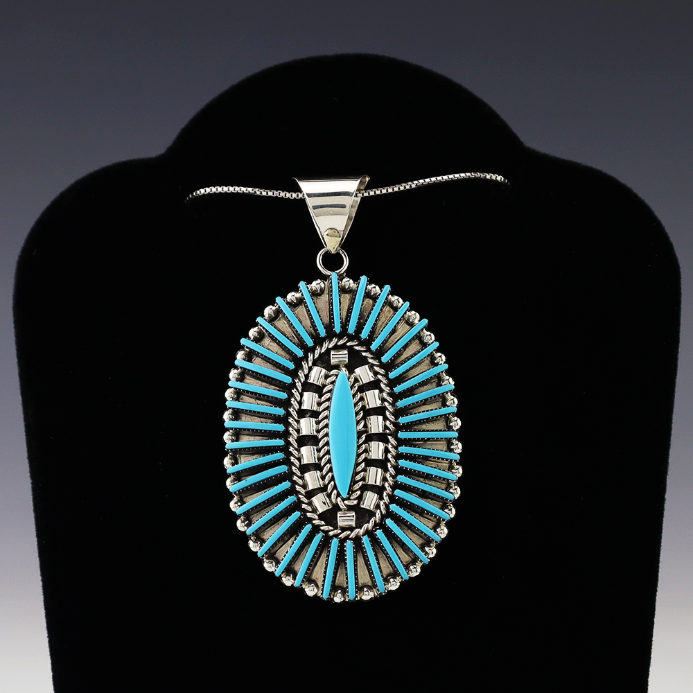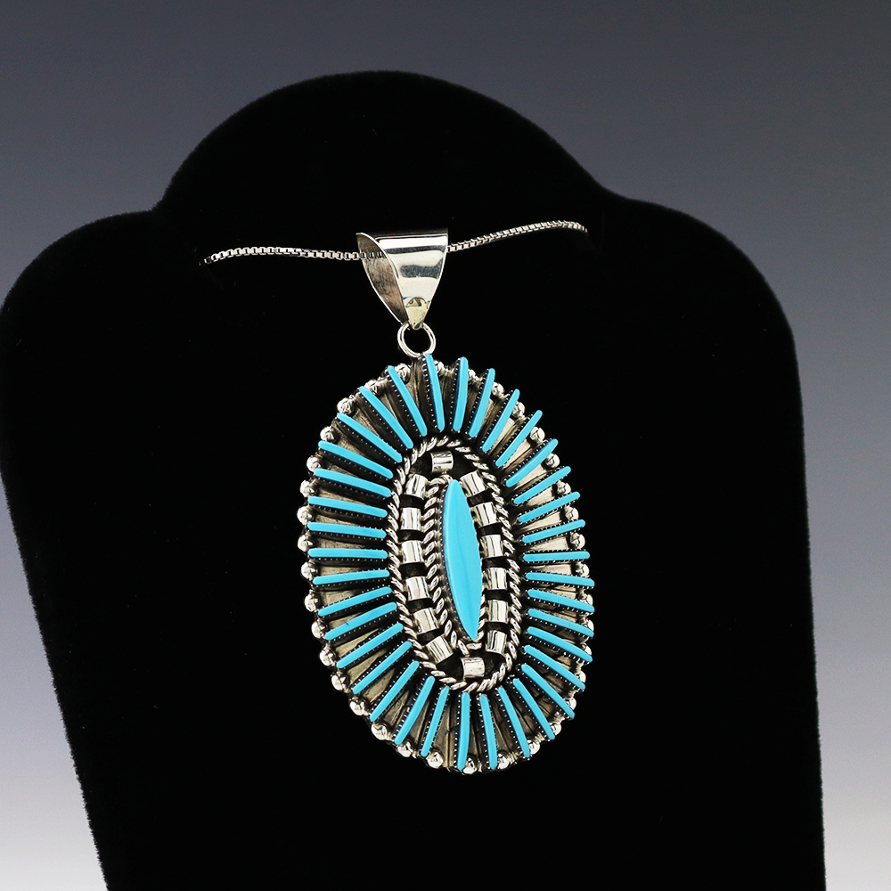 Zuni artist Barton Cooeyate hand crafted this stunning needle point pendant. Each stone is hand cut, polished, and set into a sterling silver setting. The pendant is set with Turquoise. (Chain not included) Weighs 10 grams. Signed