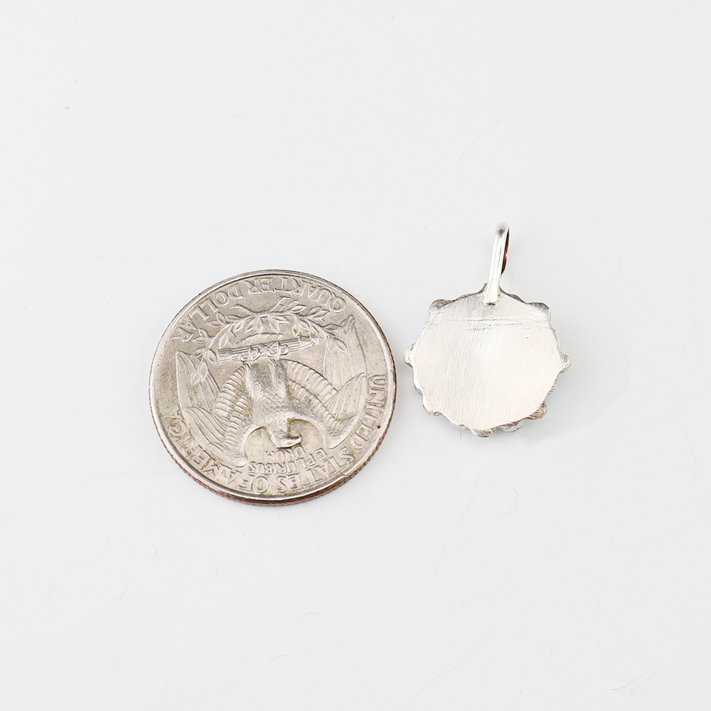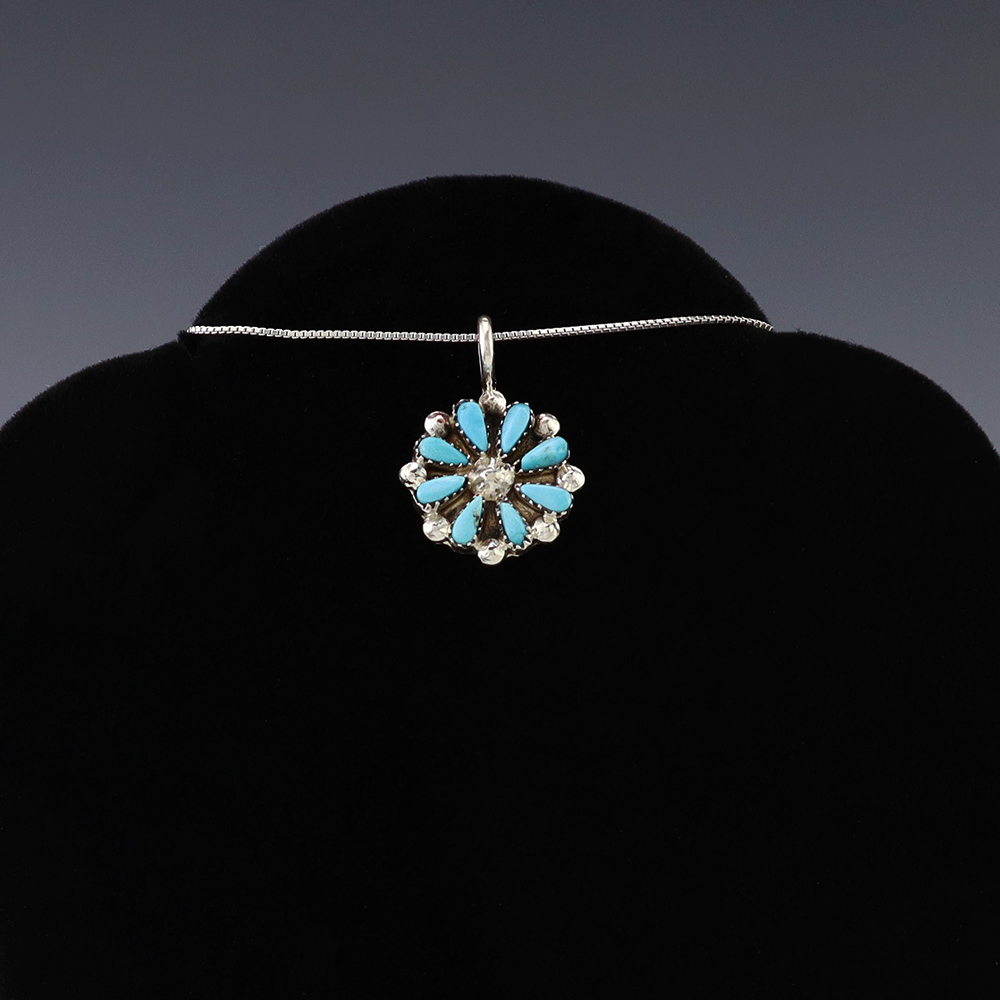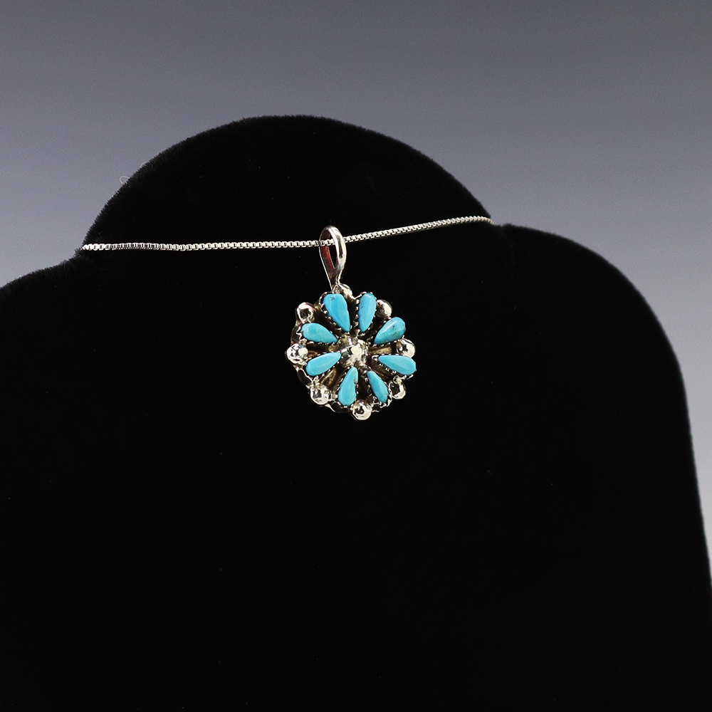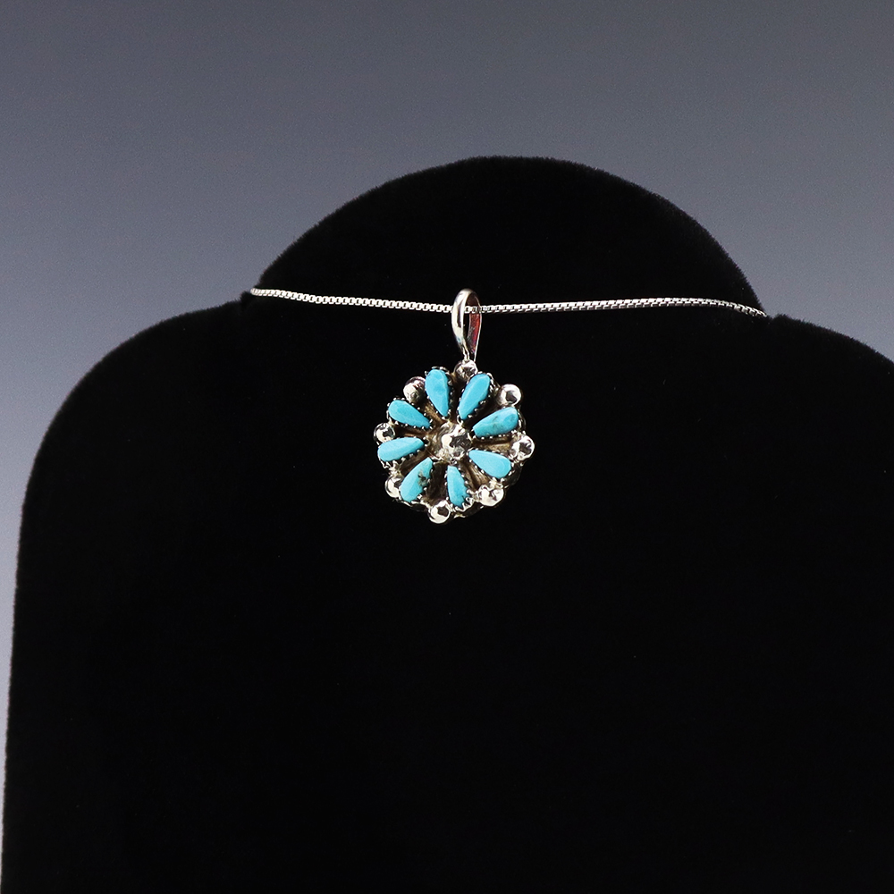 Zuni artists David and Sarita Leekity made this lovely pendant. Zuni artists are known for their fine lapidary skills. Each stone is hand cut, polished, and set into a sterling silver setting. The pendant is inlaid with Turquoise. Weighs 2 grams. (Chain not included)