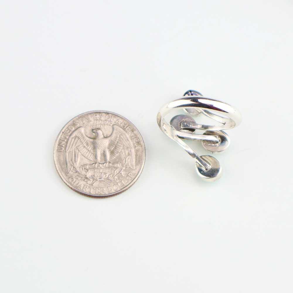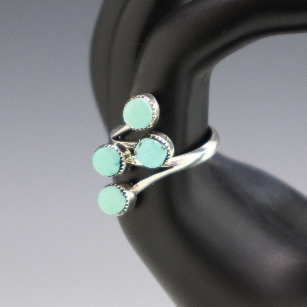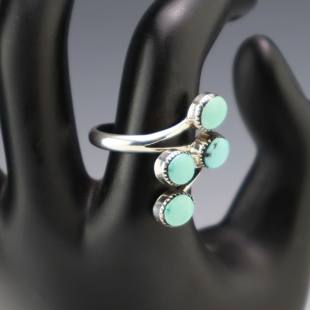 Zuni artists are known for their fine lapidary skills. Each stone is hand cut, polished, and set into a sterling silver setting. The ring is set with Turquoise stones. Weighs 4 grams. Size is adjustable. Signed