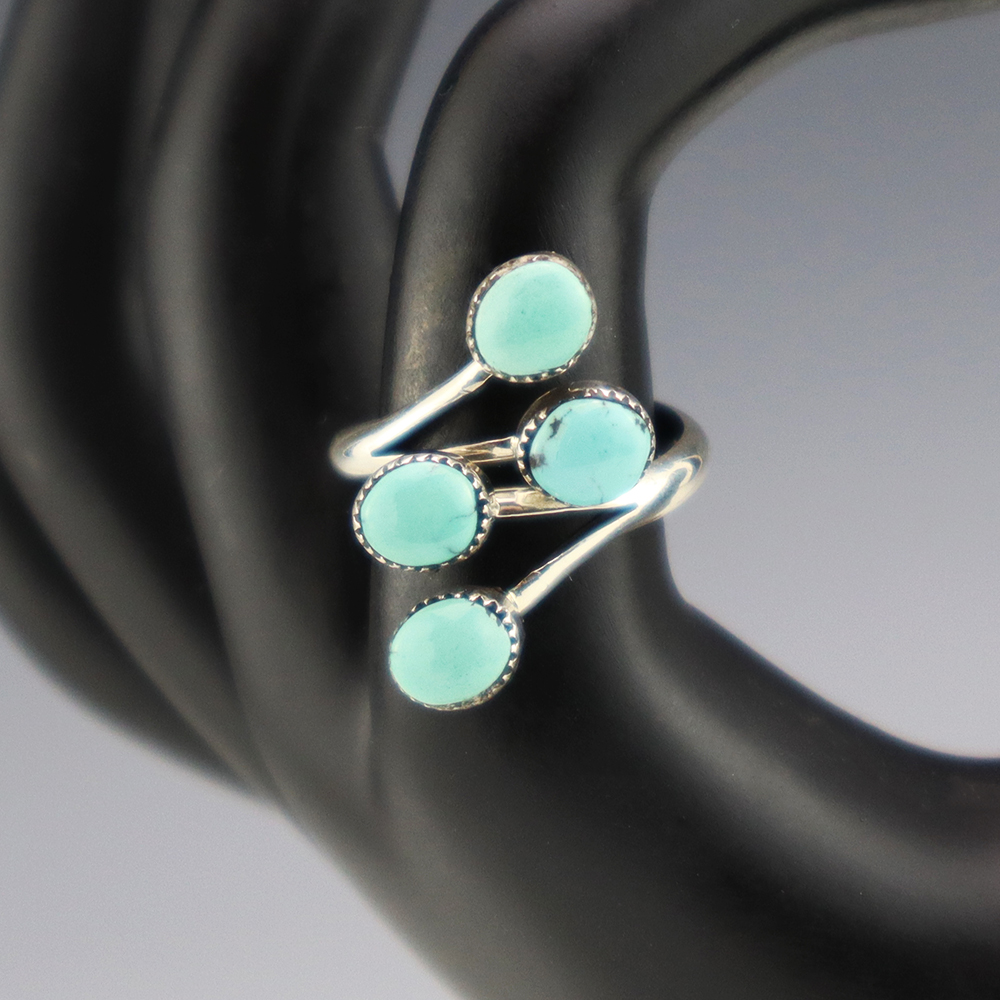 Zuni artists are known for their fine lapidary skills. Each stone is hand cut, polished, and set into a sterling silver setting. The ring is set with Turquoise stones. Weighs 4 grams. Size is adjustable. Signed
