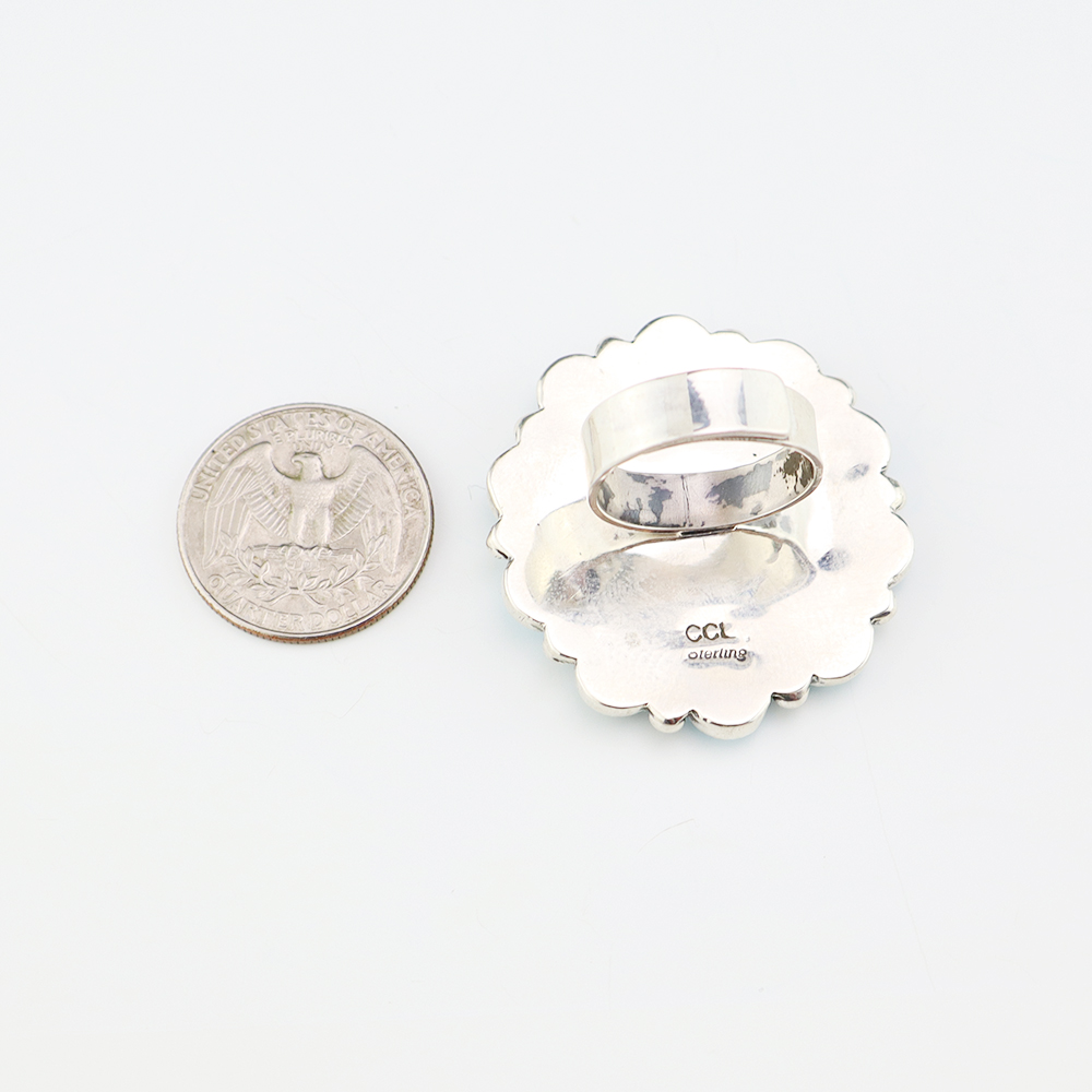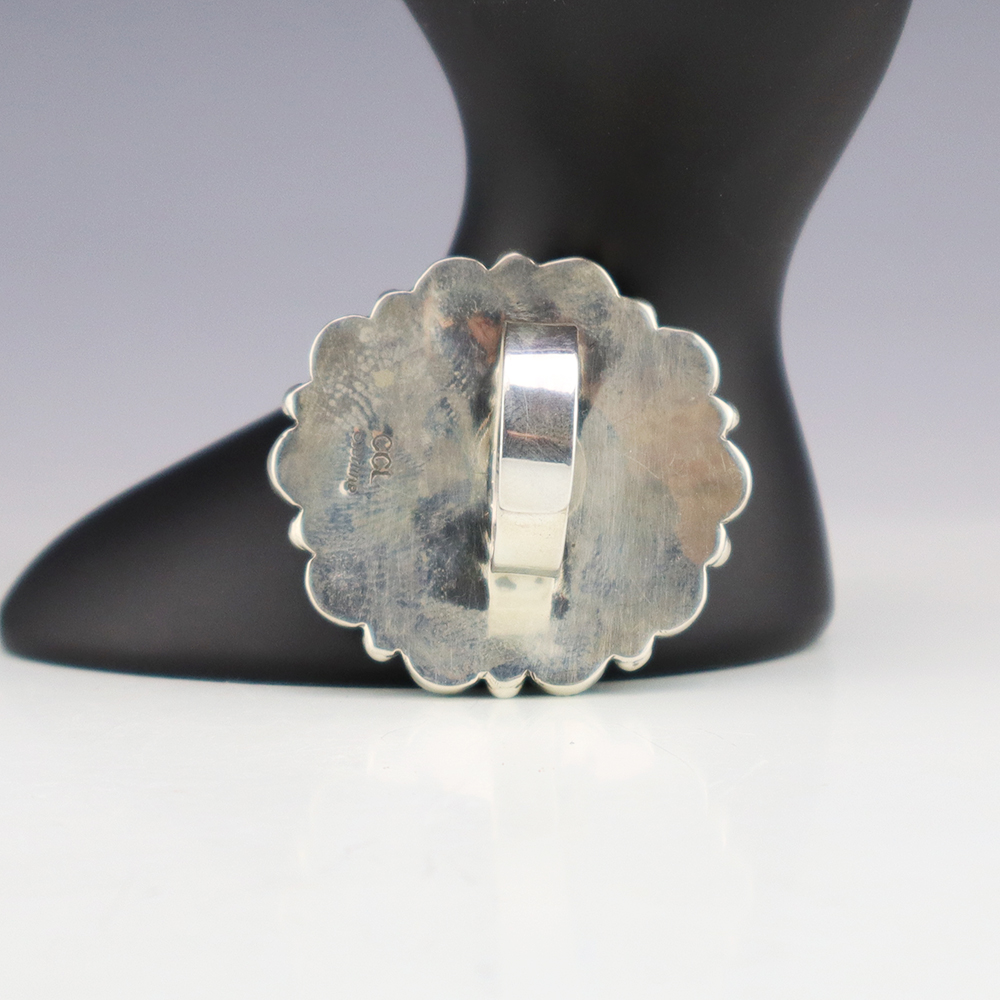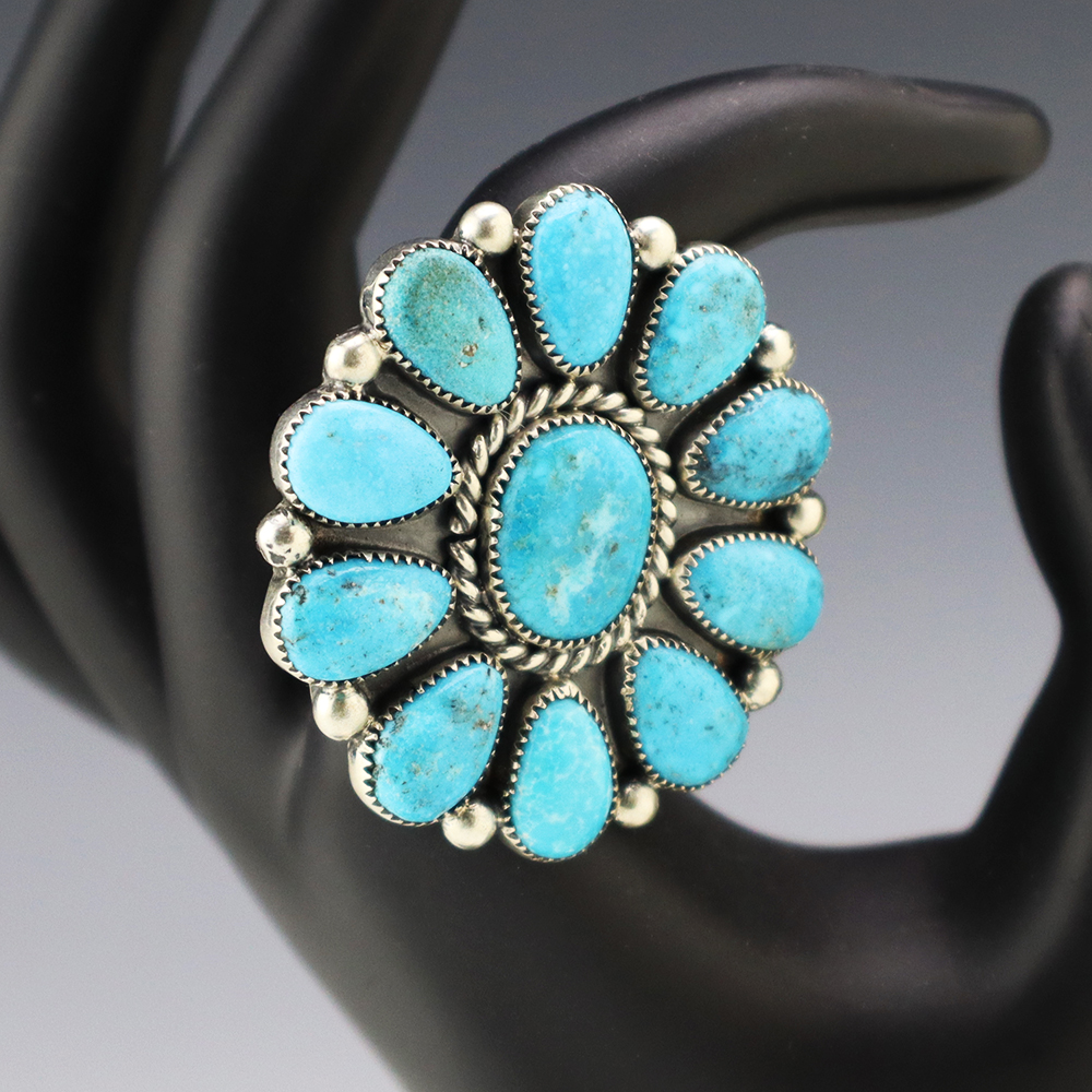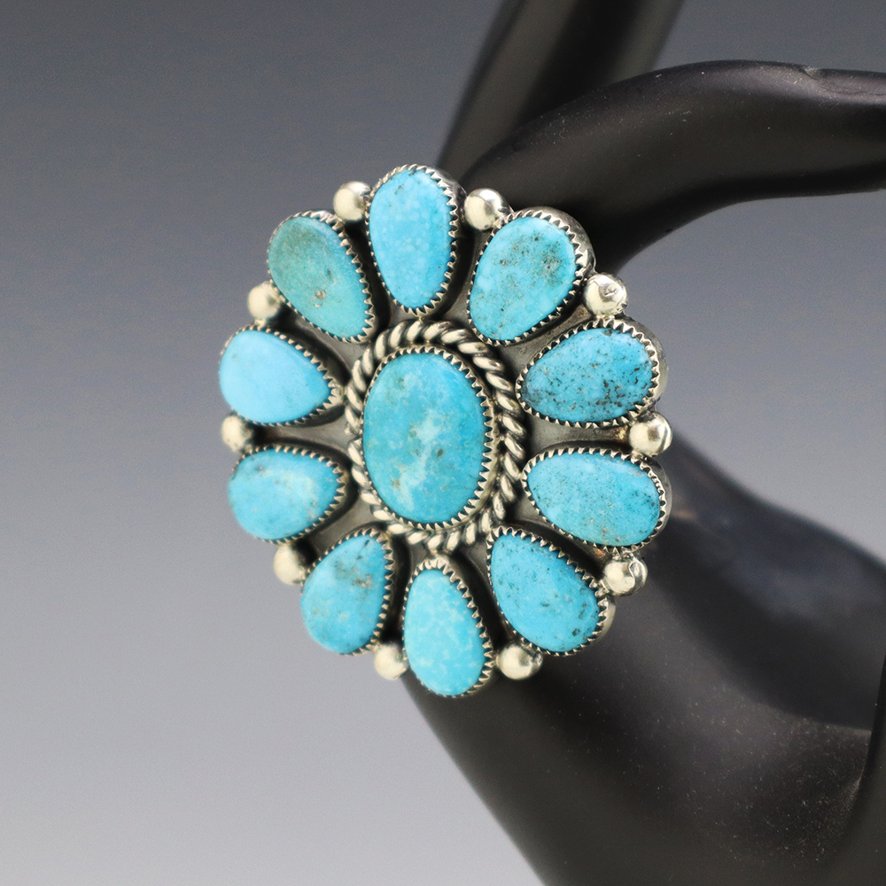 Amazing inlay work! Zuni jewelry makers, Nancy and Sheldon Westika created this magnificent ring. Made out of sterling silver and inlaid with Kingman Turquoise and Jet. Zuni artists are known for their lapidary work. The Westikas have been making jewelry since the 1970’s and they are known for their fine...