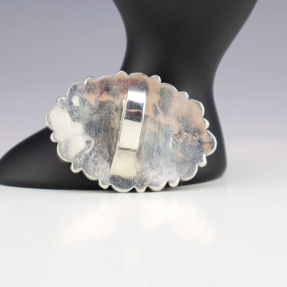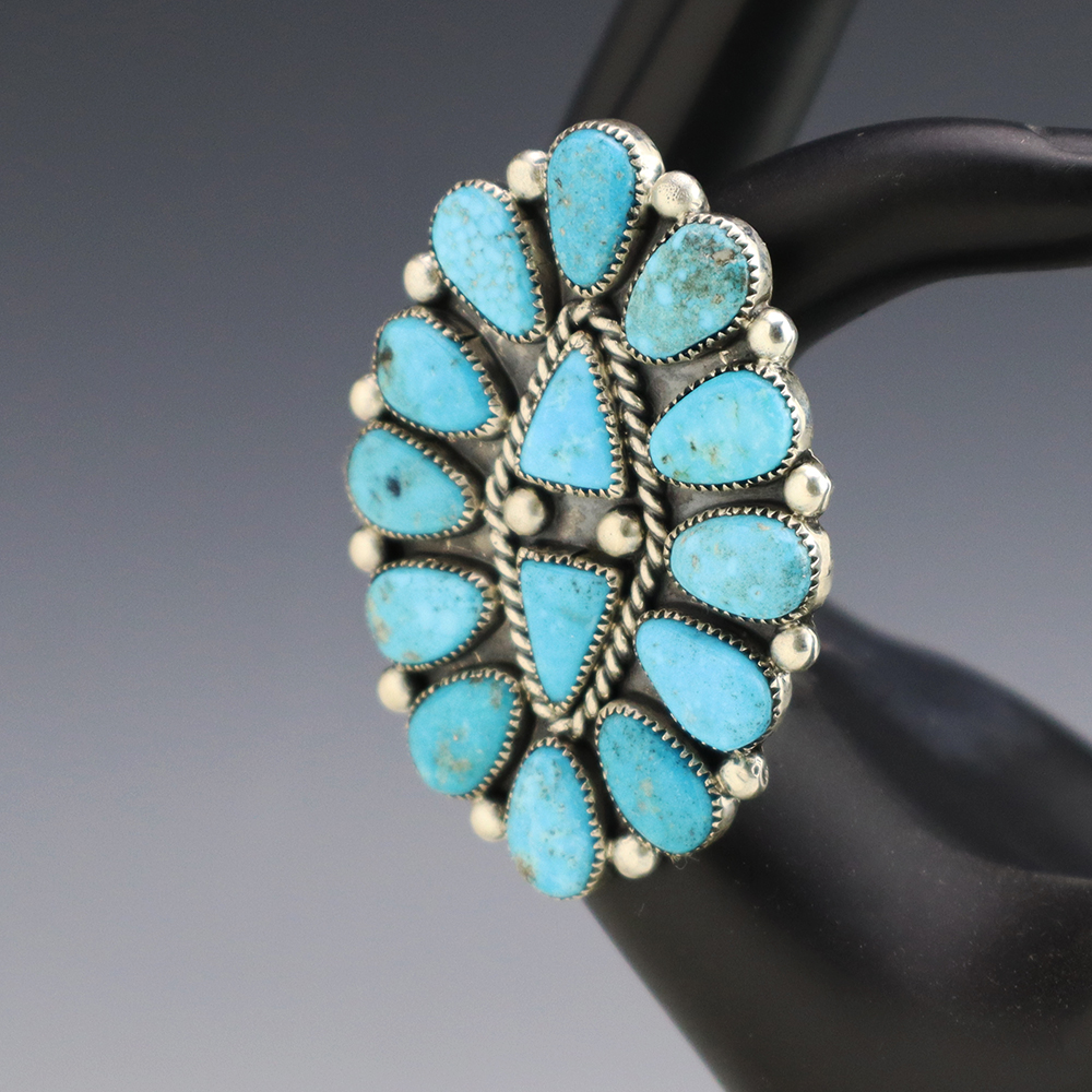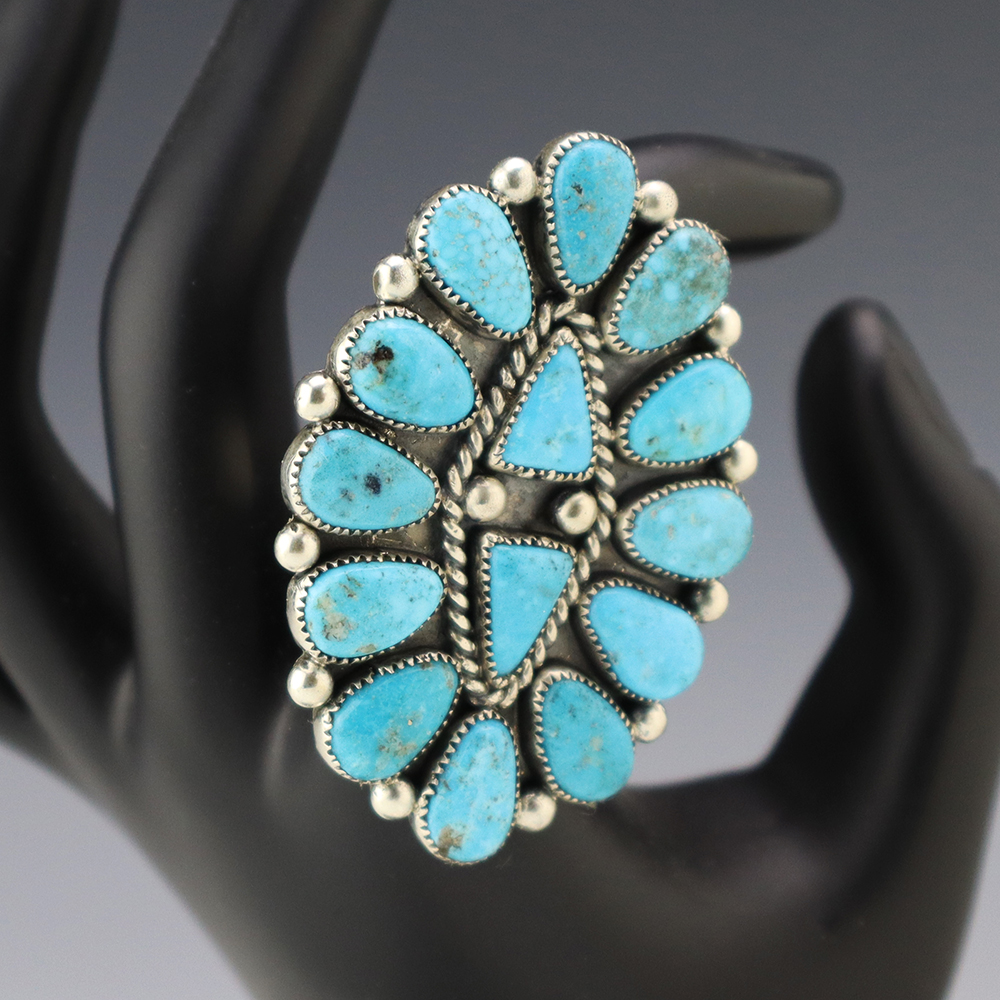 Zuni jewelry makers, Nancy and Sheldon Westika hand crafted this magnificent ring. Made out of sterling silver and inlaid with Kingman Turquoise and Jet. Zuni artists are known for their lapidary work. The Westikas have been making jewelry since the 1970’s and they are known for their fine inlay work. ...