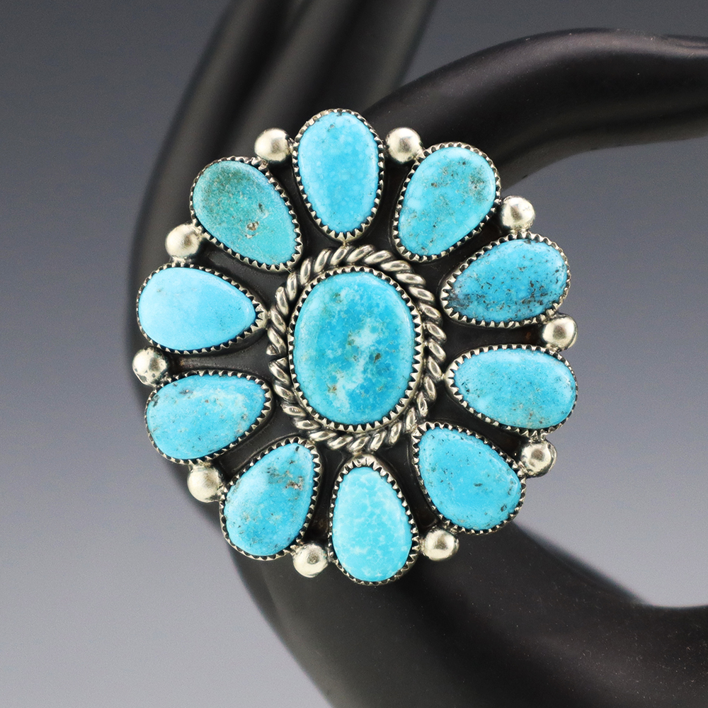 Amazing inlay work! Zuni jewelry makers, Nancy and Sheldon Westika created this magnificent ring. Made out of sterling silver and inlaid with Kingman Turquoise and Jet. Zuni artists are known for their lapidary work. The Westikas have been making jewelry since the 1970’s and they are known for their fine...