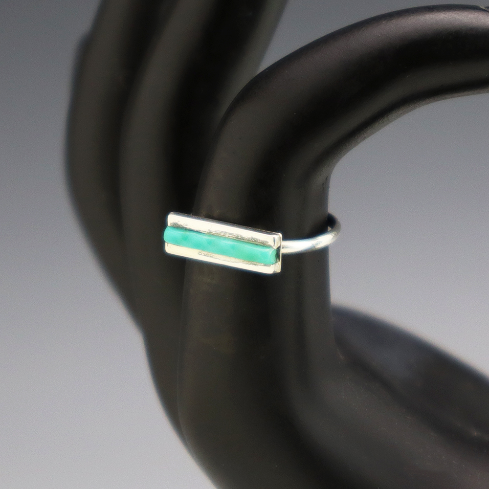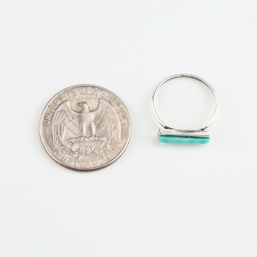 Zuni artists are known for their fine lapidary skills. Each stone is hand cut, polished, and set into a sterling silver setting. The ring is set with Turquoise stones. Hand made by Zuni artist Dentin Bobelu. Weighs 2 grams. Size 5 1/2.