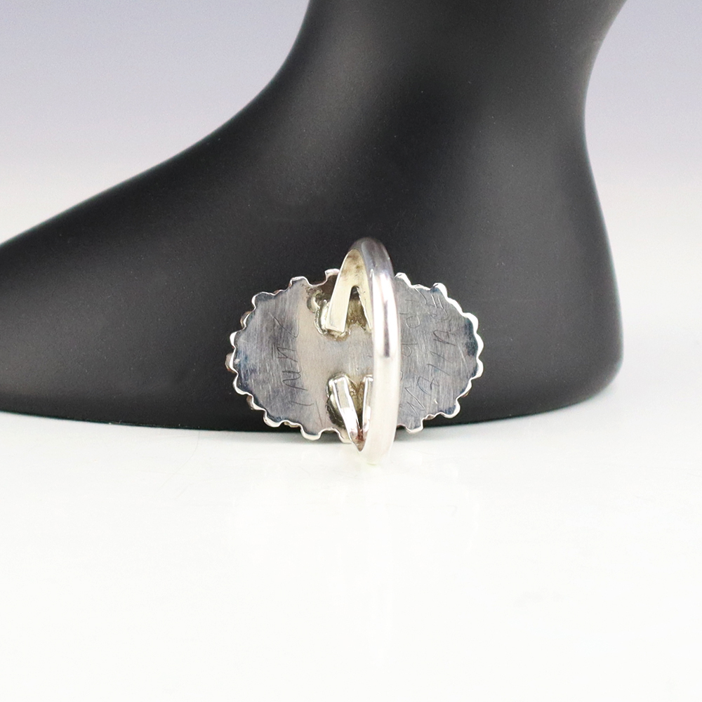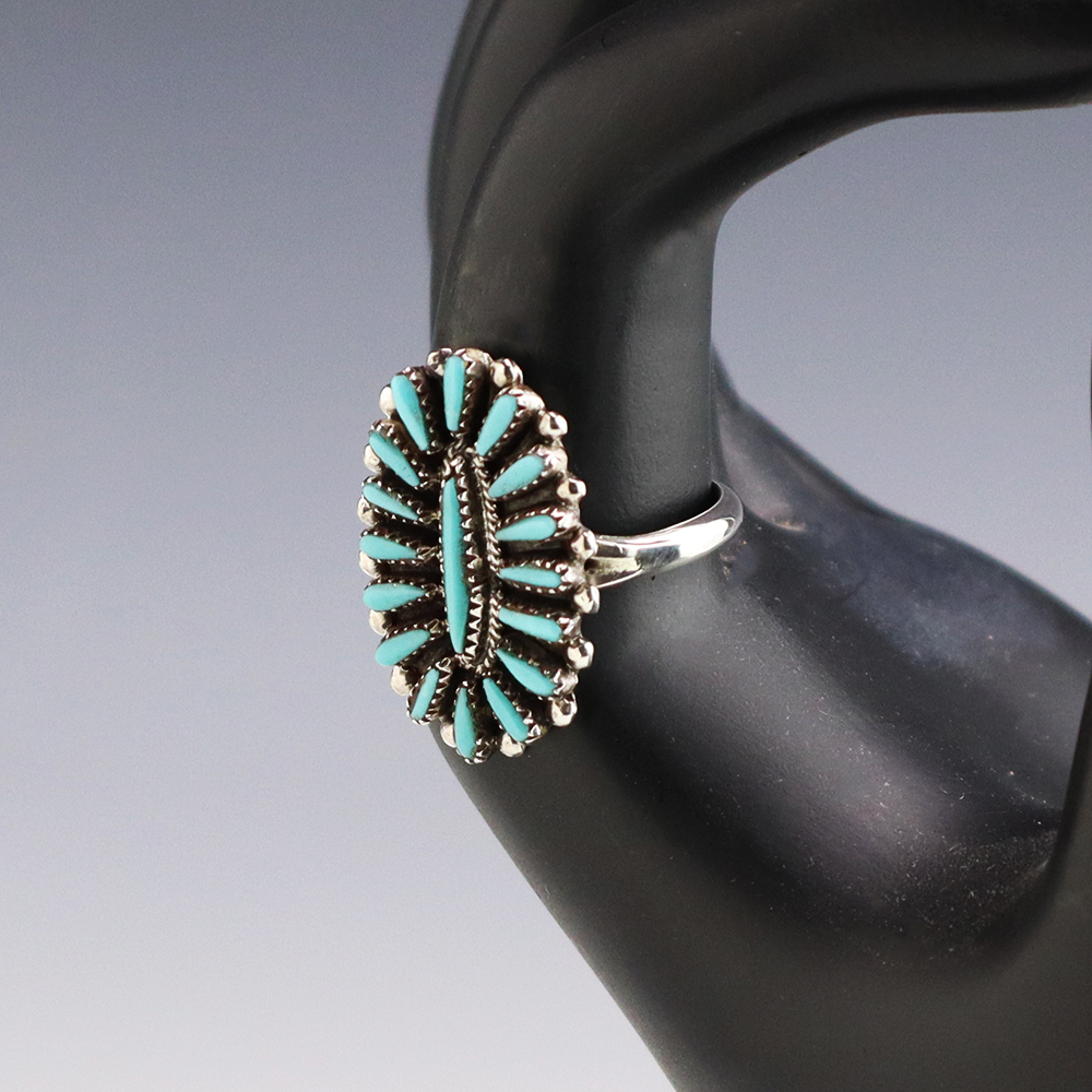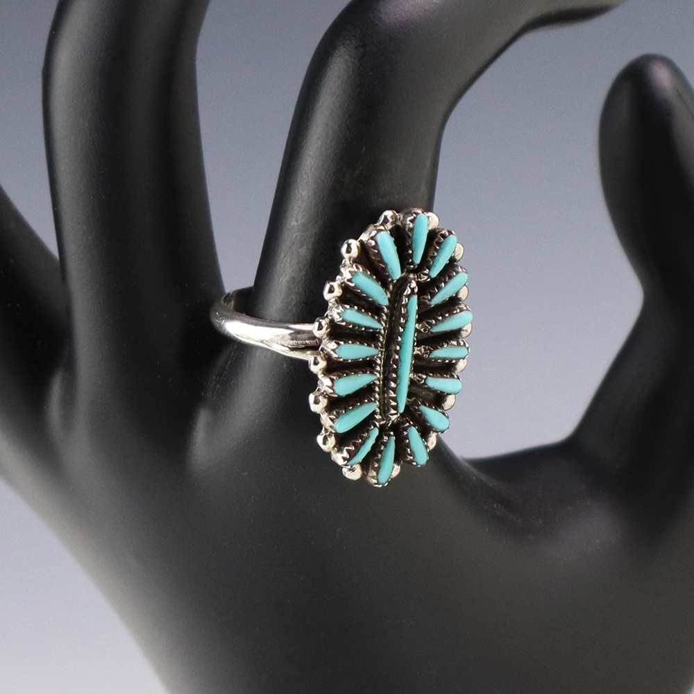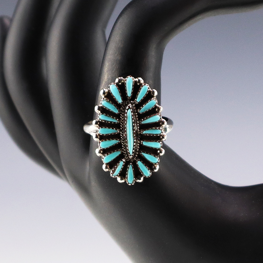 Zuni artist Judy Wallace made this beautiful ring out of sterling silver and Turquoise. Great needlepoint design! Weighs 6 grams. Size 9 1/4. Signed.