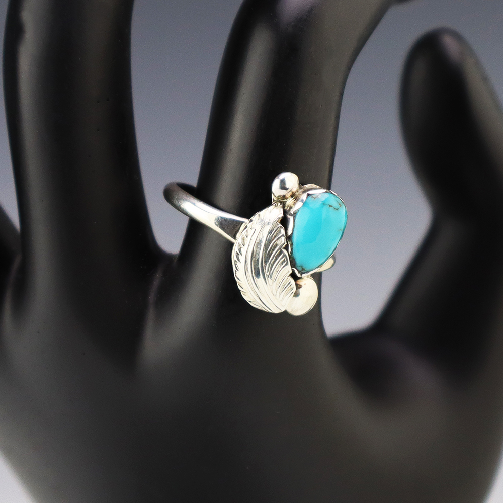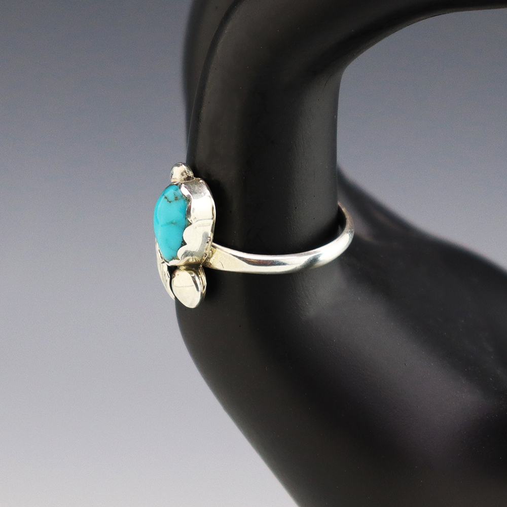 Zuni jeweler Lydia Simplicio made this lovely ring. Zuni artists are known for their fine lapidary skills. Each stone is hand cut, polished, and set into a sterling silver setting. The ring is set with a Turquoise stone . Weighs 2 grams. Size 8 3/4. Signed