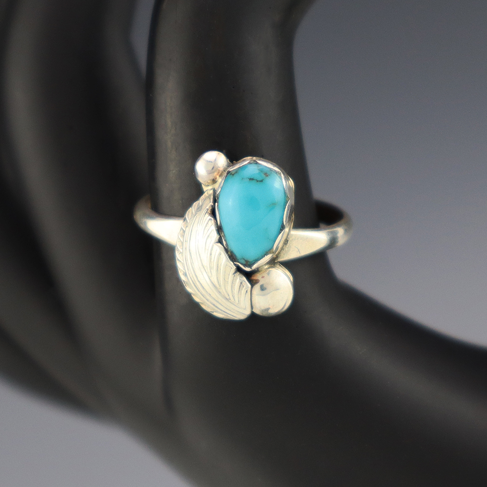 Zuni jeweler Lydia Simplicio made this lovely ring. Zuni artists are known for their fine lapidary skills. Each stone is hand cut, polished, and set into a sterling silver setting. The ring is set with a Turquoise stone . Weighs 2 grams. Size 8 3/4. Signed