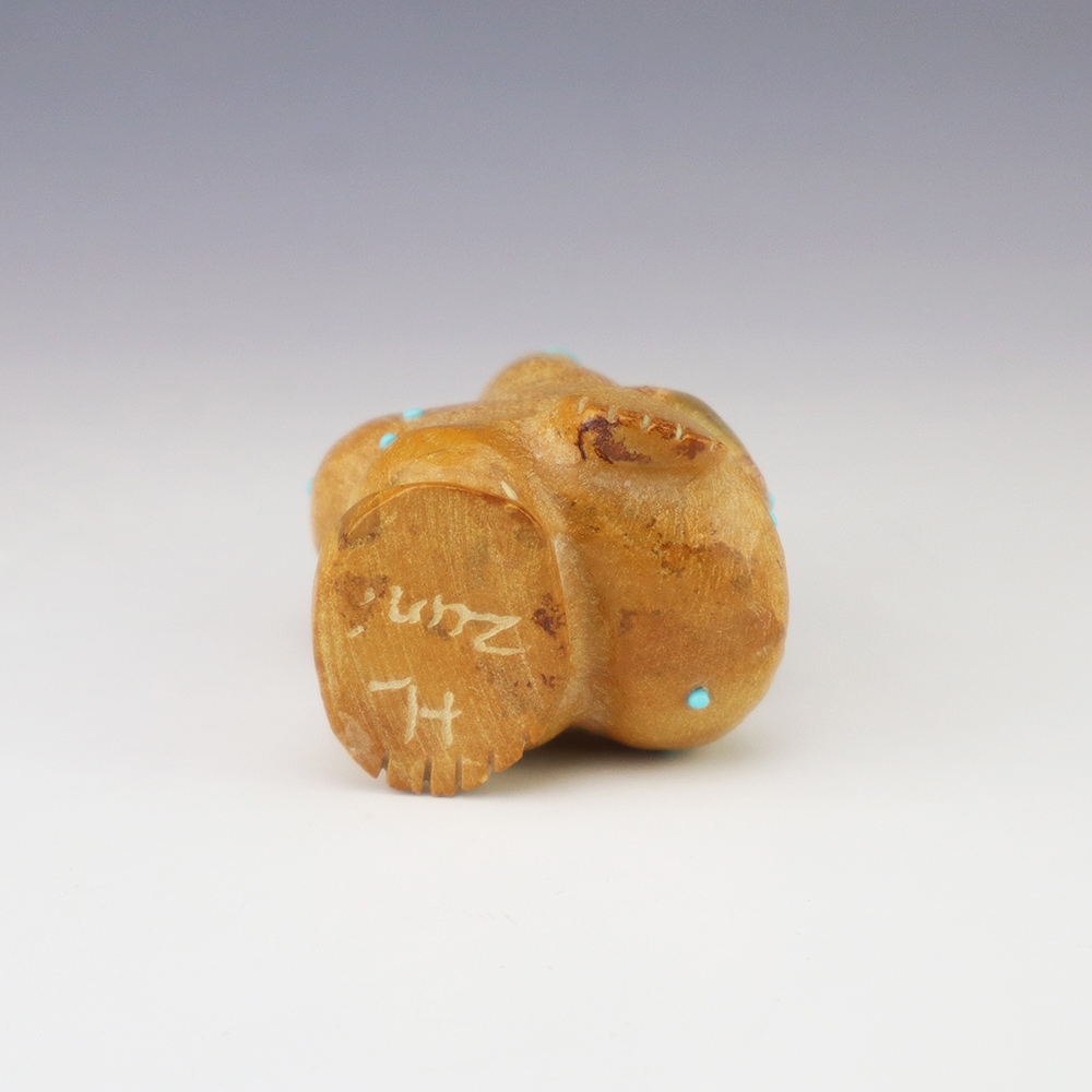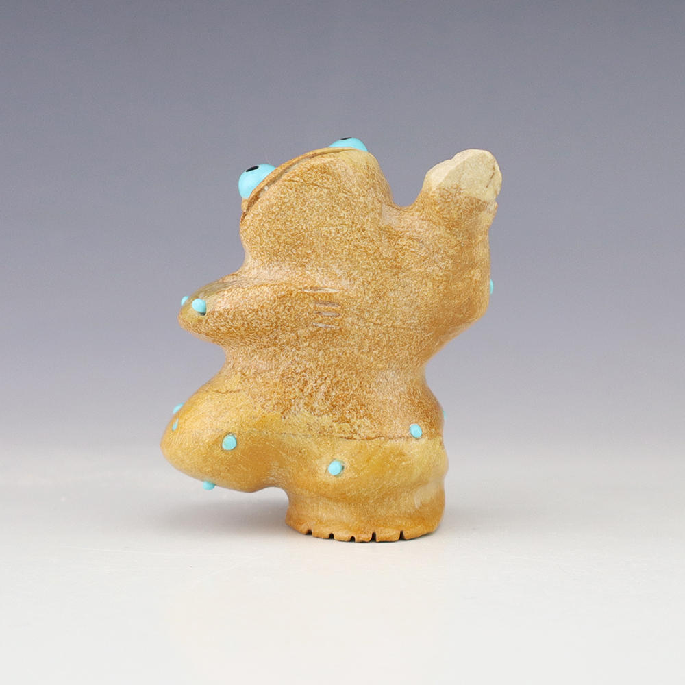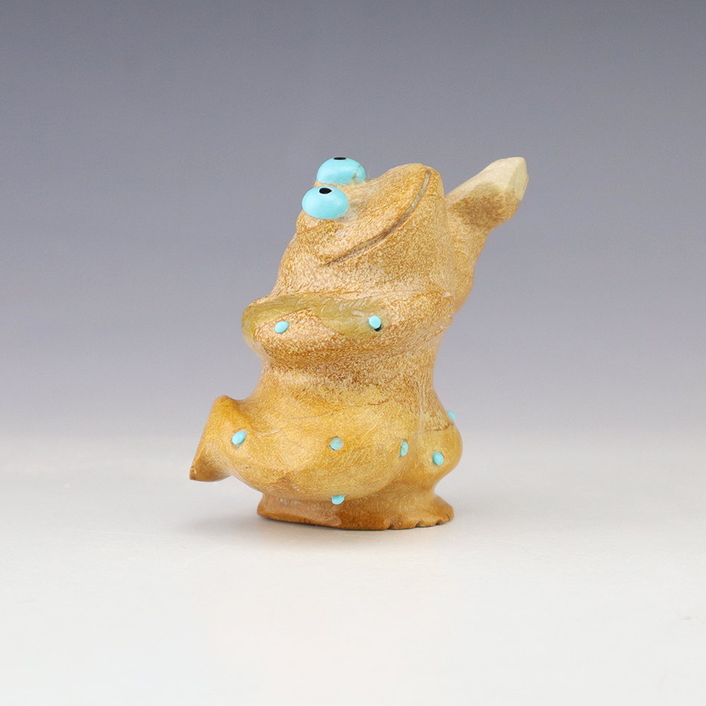 Zuni fetish artist Hayes Leekya comes from a family of carvers. This wonderful Frog is is an outstanding example of Zuni craftsmanship. Hand carved out Travertine (Zuni Rock) with Turquoise and Penn Shell eyes. In prehistoric times, frog carvings appeared in jewelry. Zuni frog fetishes are associated with rain, abundance, and fertility. A great addition to your Native American or Zuni fetish collection. Signed