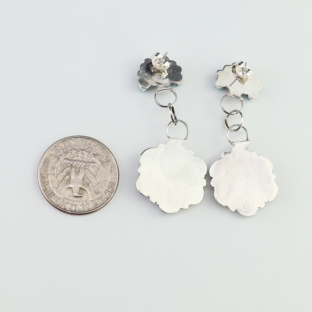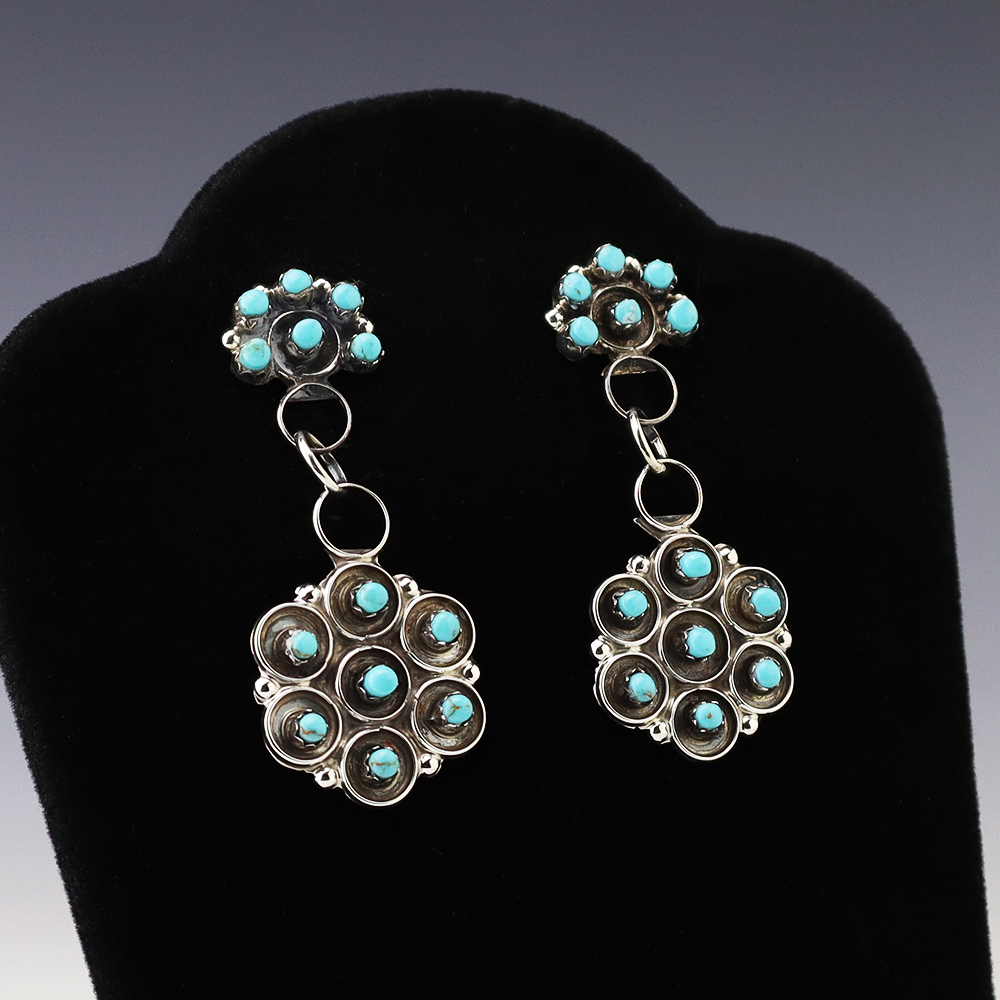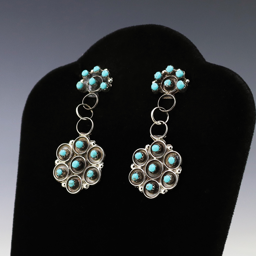 Made in the highly regarded petit point style, each earring features vivid blue turquoise stones inlaid into a sterling silver setting. Hand made by Zuni jeweler Joann Cheama. Weighs 10 grams. These gorgeous earrings will become a versatile accessory in your jewelry collection.