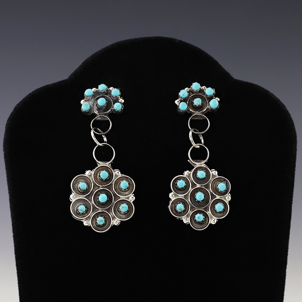 Made in the highly regarded petit point style, each earring features vivid blue turquoise stones inlaid into a sterling silver setting. Hand made by Zuni jeweler Joann Cheama. Weighs 10 grams. These gorgeous earrings will become a versatile accessory in your jewelry collection.