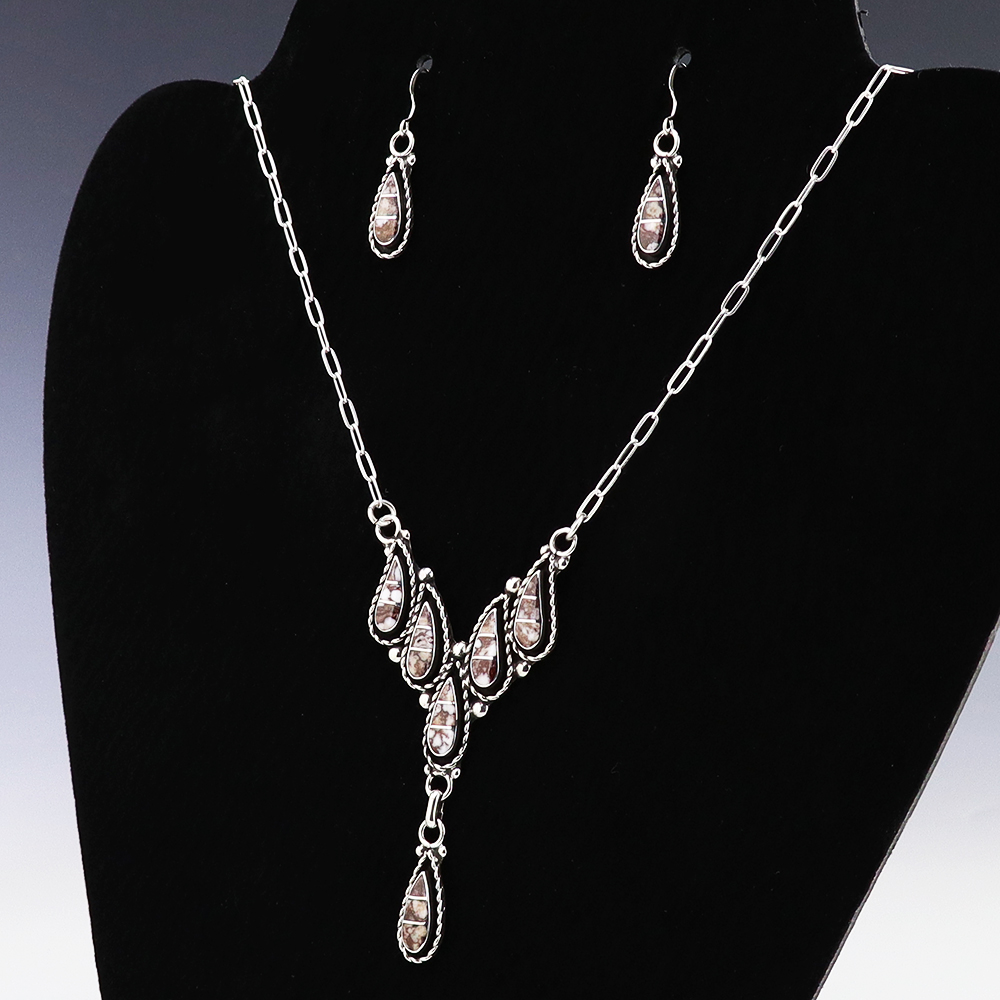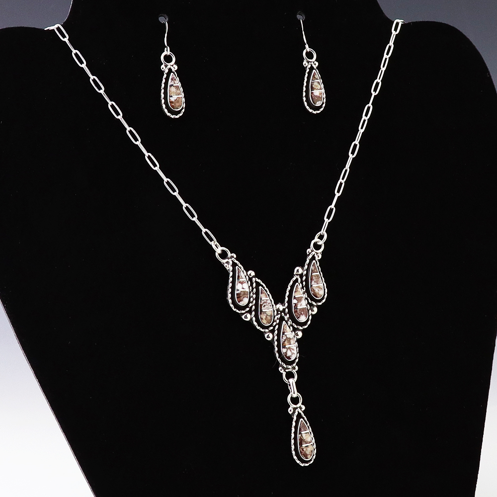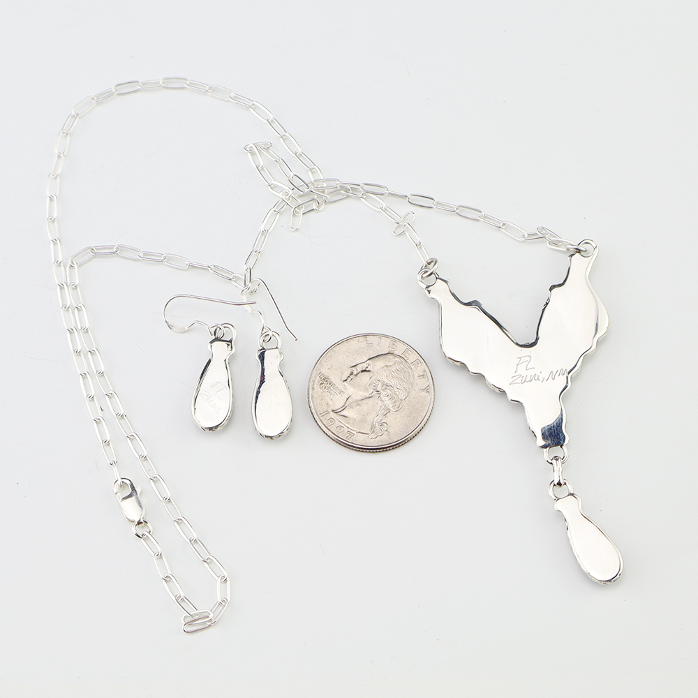 Zuni artist Faye Lowsayatee made this gorgeous necklace. Sterling silver with Wild Horse inlay. Comes with matching dangle earrings. An exquisite statement piece that you will enjoy for many years. The necklace weighs 12 grams, and the earrings weigh 2 grams. Signed