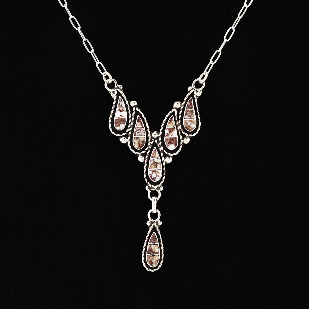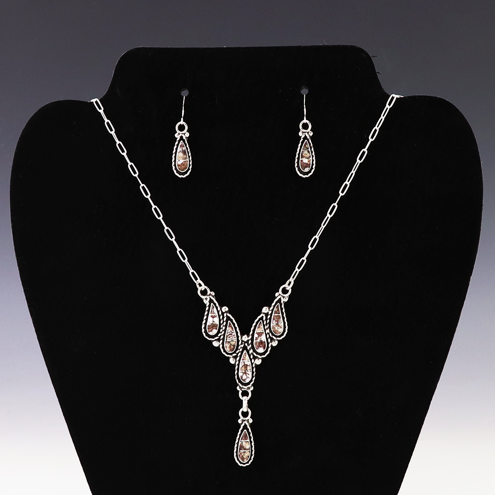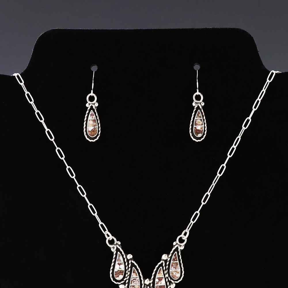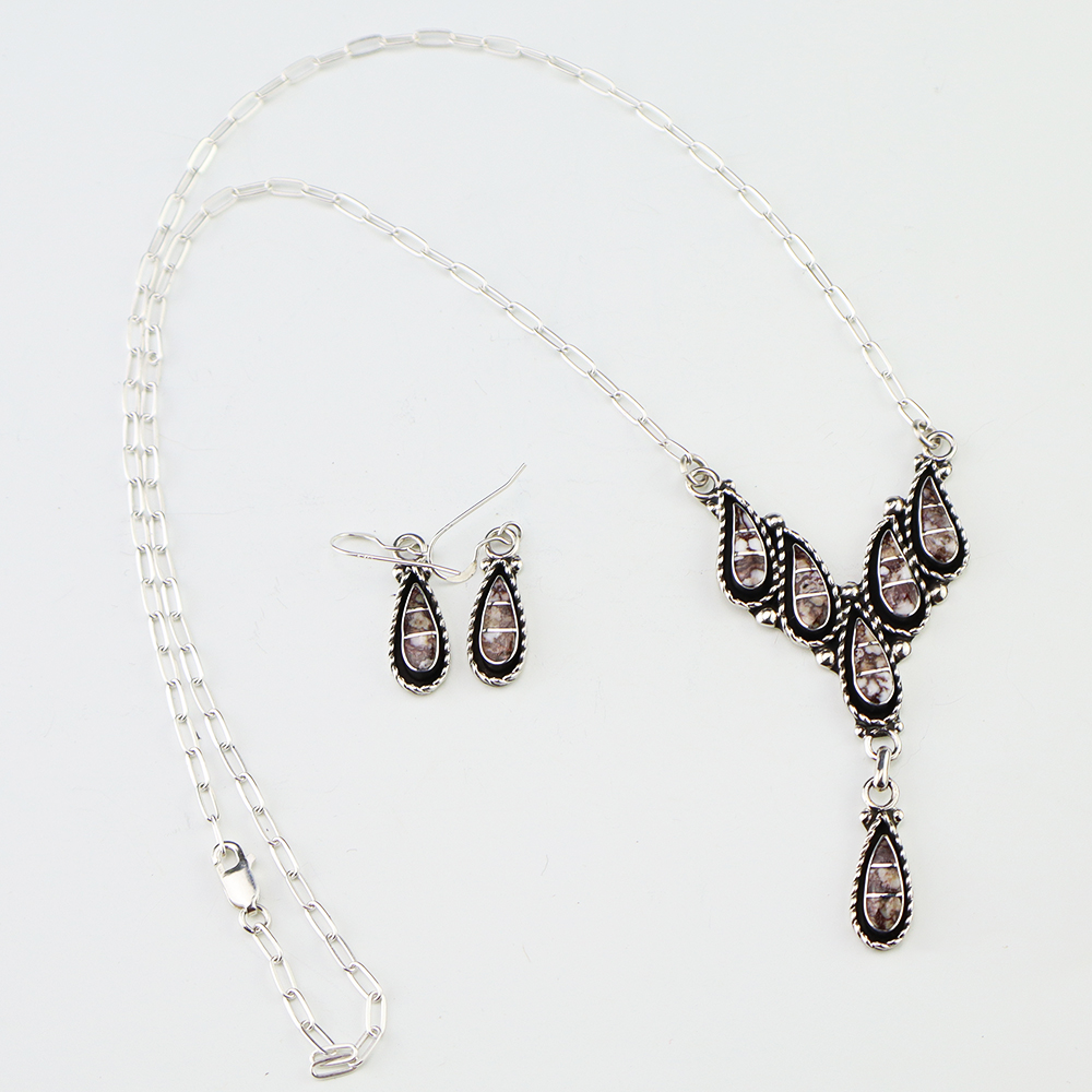 Zuni artist Faye Lowsayatee made this gorgeous necklace. Sterling silver with Wild Horse inlay. Comes with matching dangle earrings. An exquisite statement piece that you will enjoy for many years. The necklace weighs 12 grams, and the earrings weigh 2 grams. Signed