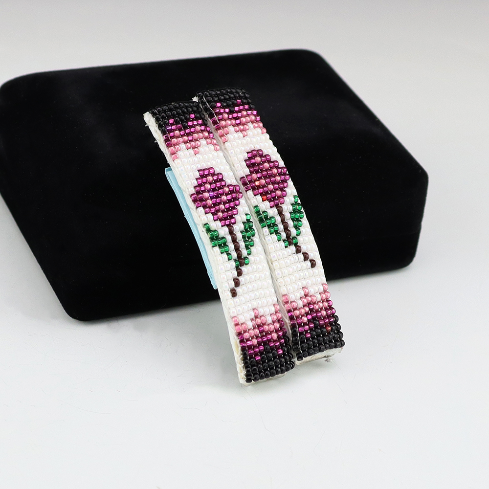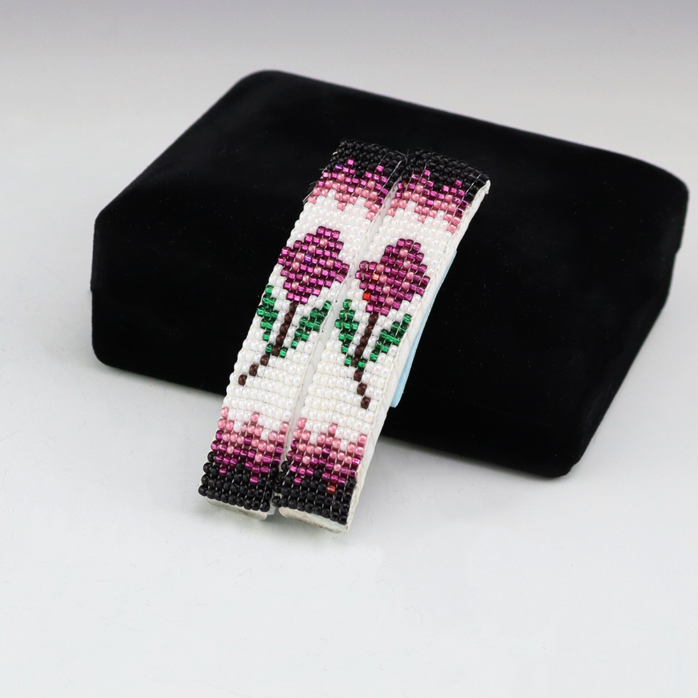 Navajo artist Judy Wilson hand beaded these lovely barrettes. Great colors that compliment the design. Judy uses tiny seed beads to create her jewelry and backs it with soft leather.