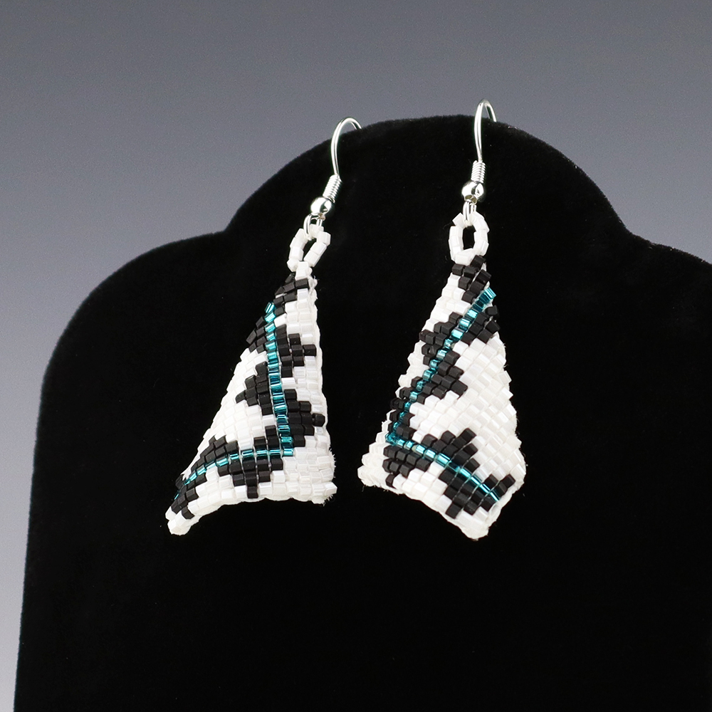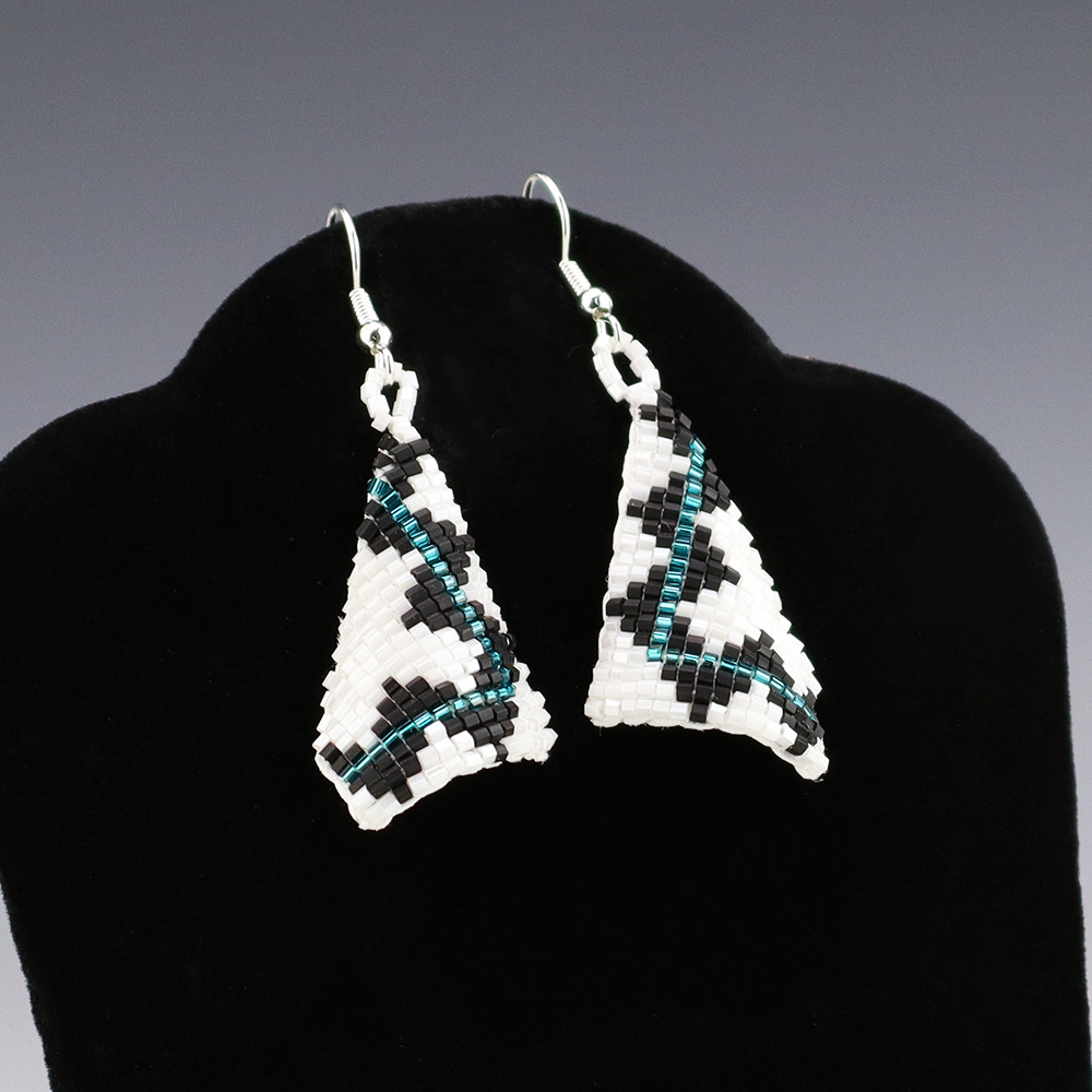 Navajo artist Geri Hatathli hand beaded these stellar earrings. Great pattern! With ear wires are 3” in length. 7/8″ x 2 1/2″ When trade beads were introduced to Native Americans, they made these colorful glass beads part of their jewelry. Over the years, glass beads have been used to complement...