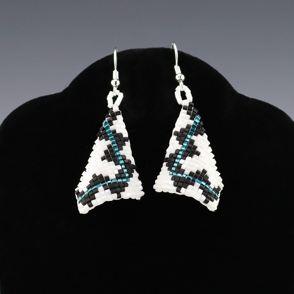 Navajo artist Geri Hatathli hand beaded these stellar earrings. Great pattern! With ear wires are 3” in length. 7/8″ x 2 1/2″ When trade beads were introduced to Native Americans, they made these colorful glass beads part of their jewelry. Over the years, glass beads have been used to complement...