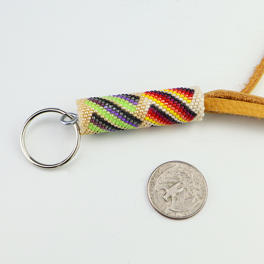 Carry your keys around in style! Navajo artist Lorraine Burbank hand beaded this beautiful key ring. Great colors and patterns.