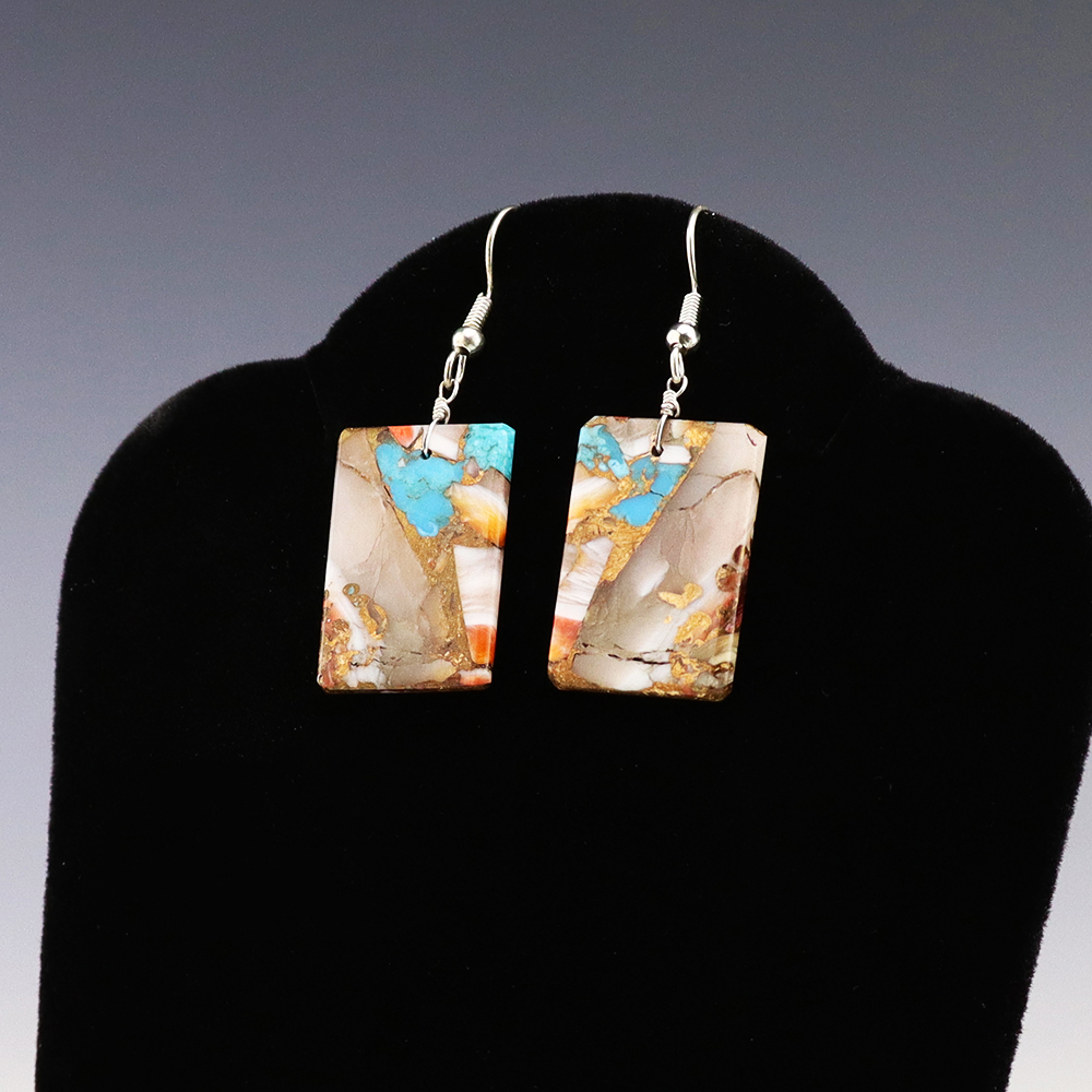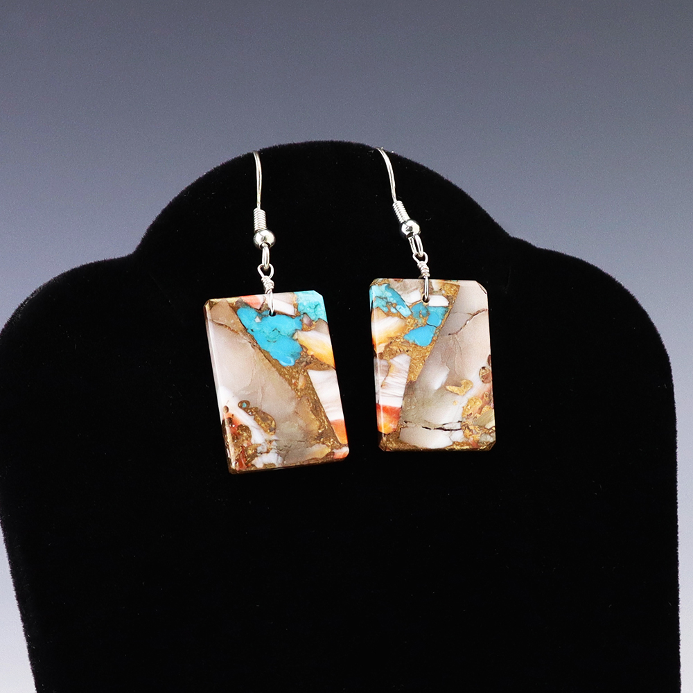 Lovely earrings hand made out of composite shell and turquoise by Navajo artist Jameson Pete. These wonderful earrings will become a versatile accessory in your jewelry collection. Weighs 6 grams.