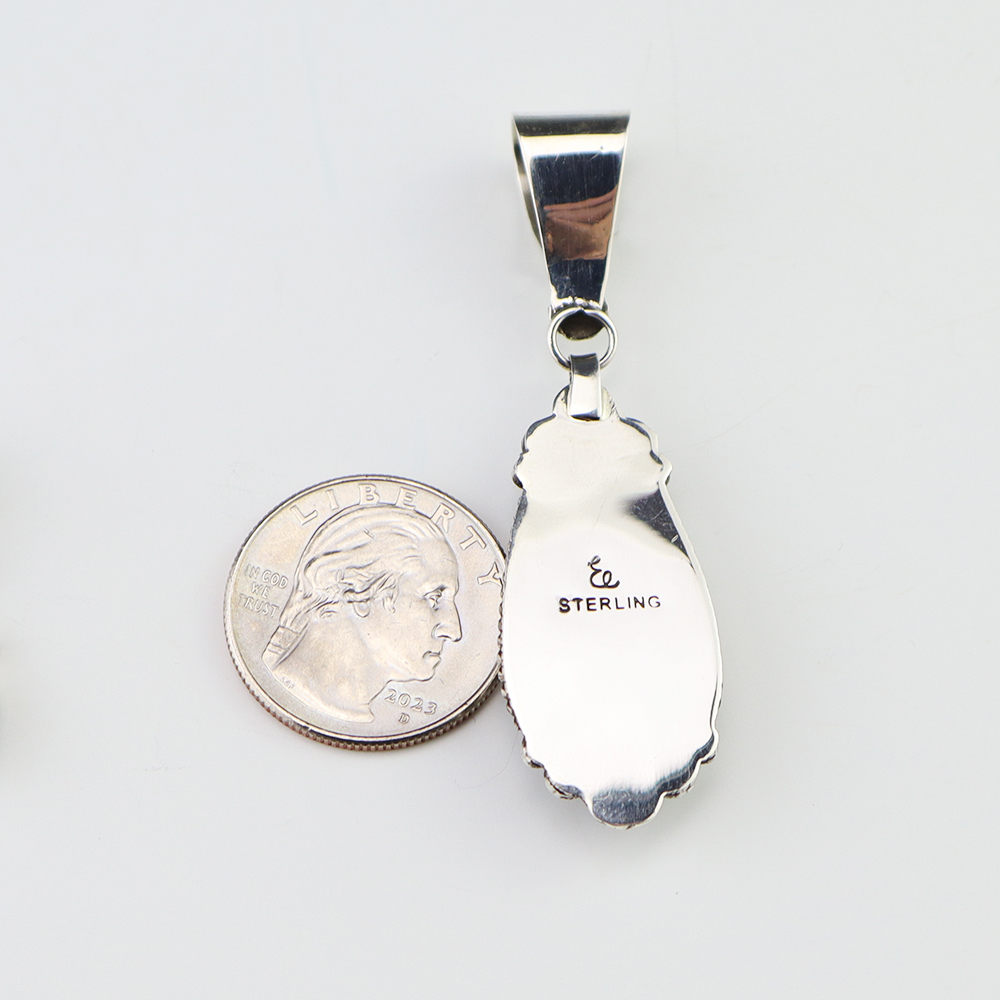 Exquisite pendant that features Turquoise, Coral, Jet, and Mother of Pearl Shell inlaid in a sterling silver setting. Hand made by Leslie and Gladys Lamy from the Zuni Pueblo. Weighs 14 grams. Signed 1 3/8” wide x 2 1/2” long Artist card included Zuni Pueblo is the largest pueblo in...