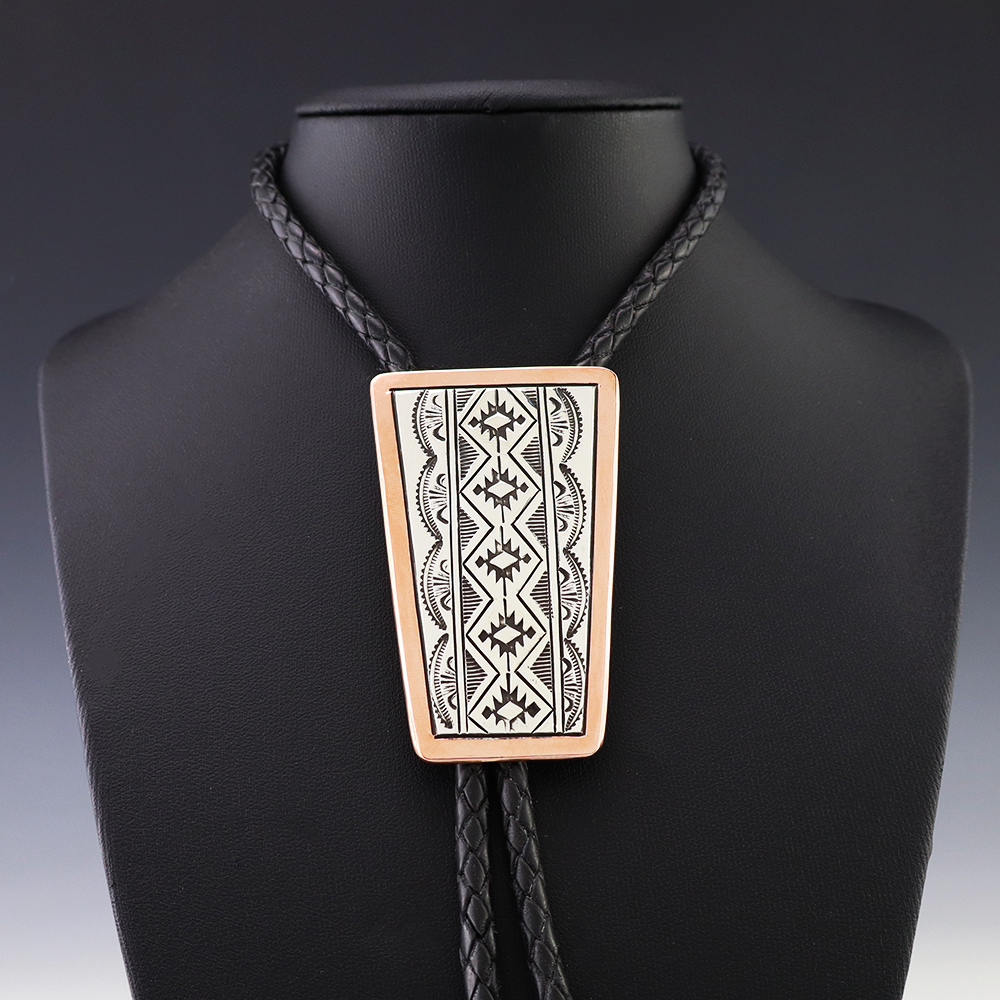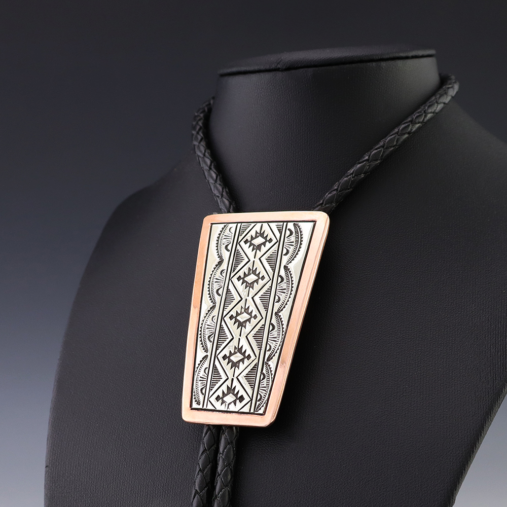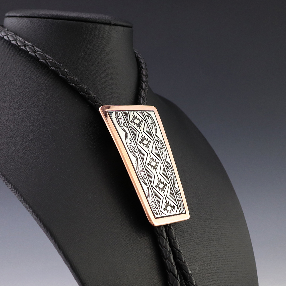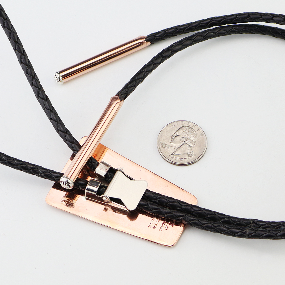 Navajo silversmith Sylvana Apache made this marvelous bolo tie out of sterling silver and copper. Great design! Weighs 62 grams. Signed