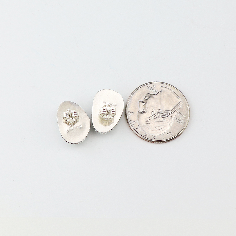 Outstanding sterling silver earrings with Mother of Pearl Shell and Turquoise inlay. Hand crafted by Zuni jewelry makers, Nancy and Sheldon Westika. The Westikas have been making jewelry since the 1970’s and they are known for their fine inlay work. Weighs 6 grams. Signed 7/8” wide x 7/8” tall 1 ...