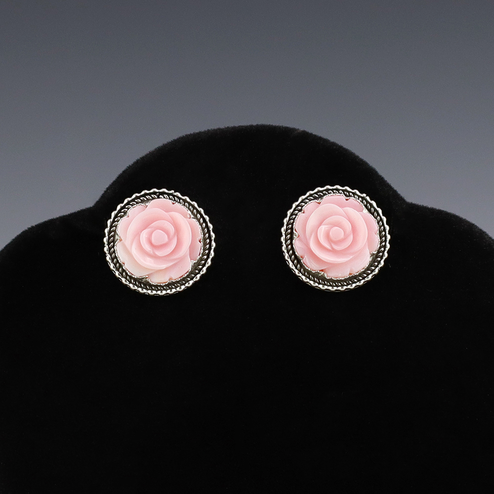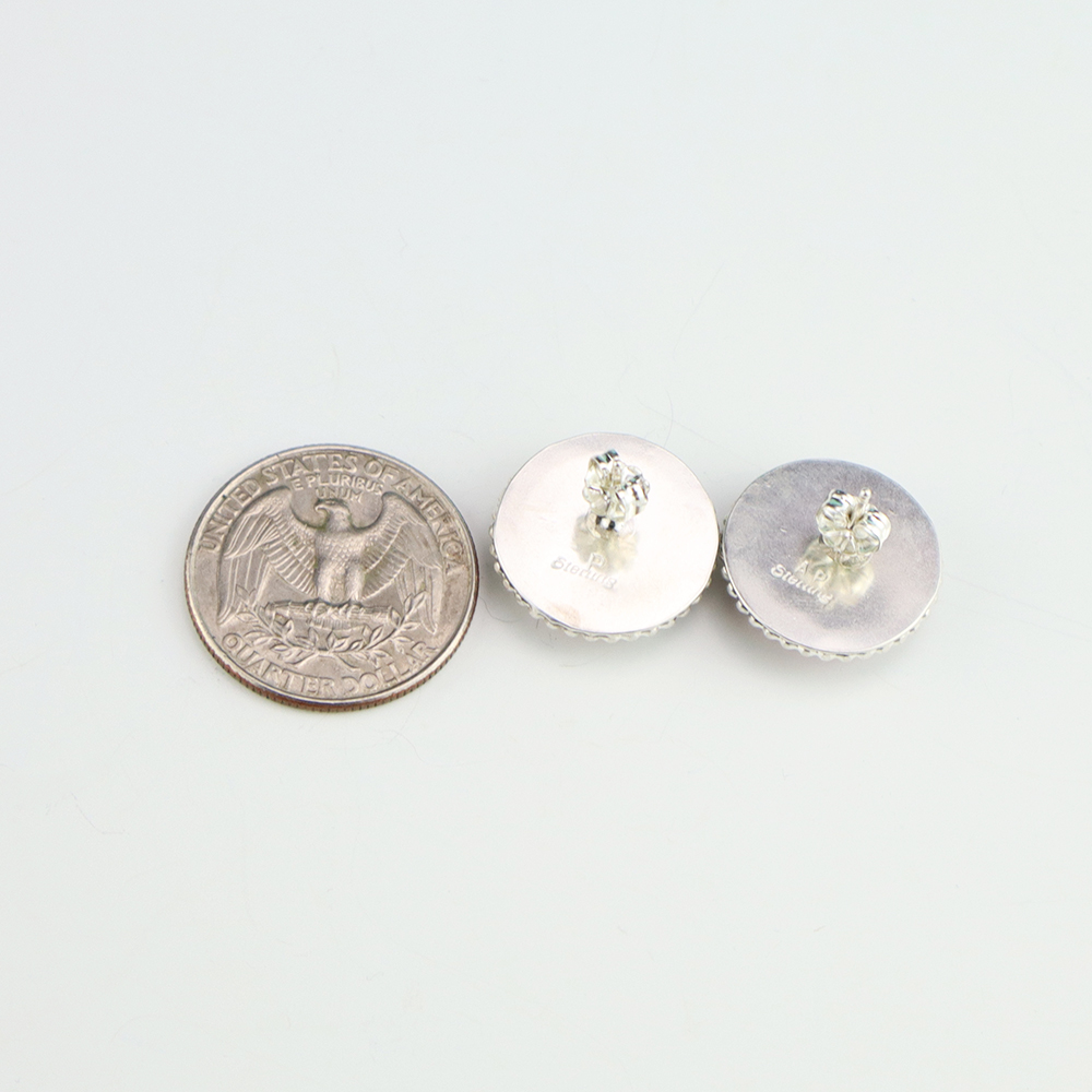 Outstanding sterling silver earrings with Mother of Pearl Shell and Turquoise inlay. Hand crafted by Zuni jewelry makers, Nancy and Sheldon Westika. The Westikas have been making jewelry since the 1970’s and they are known for their fine inlay work. Weighs 6 grams. Signed 7/8” wide x 7/8” tall 1 ...