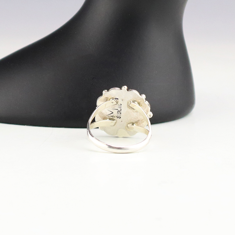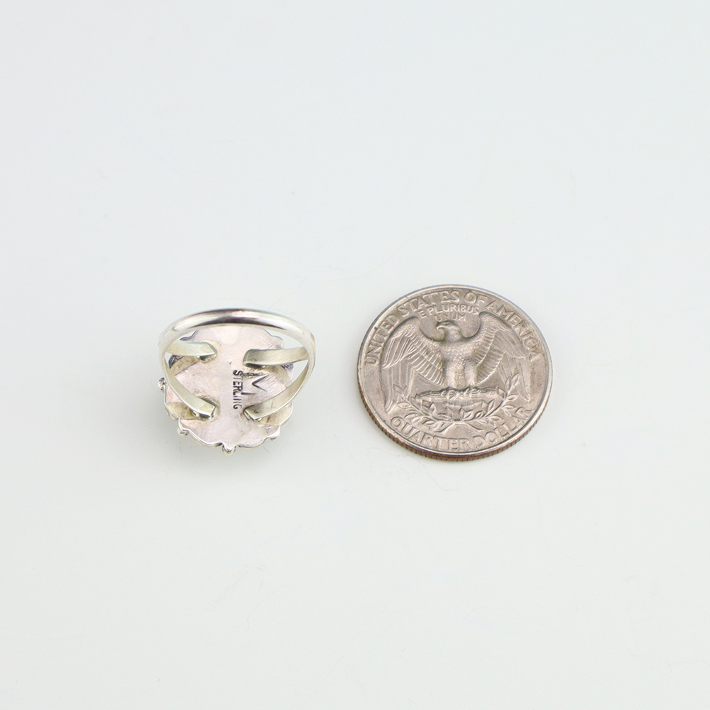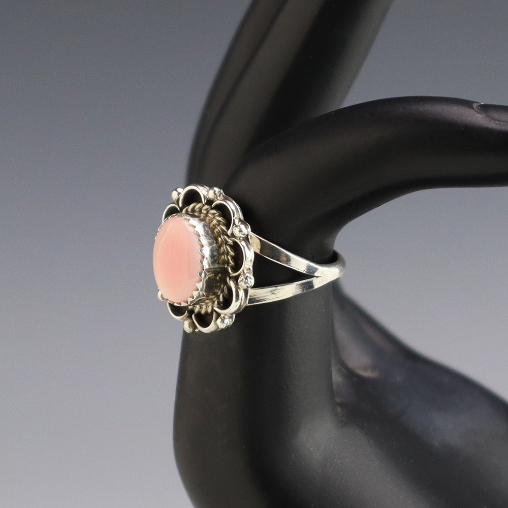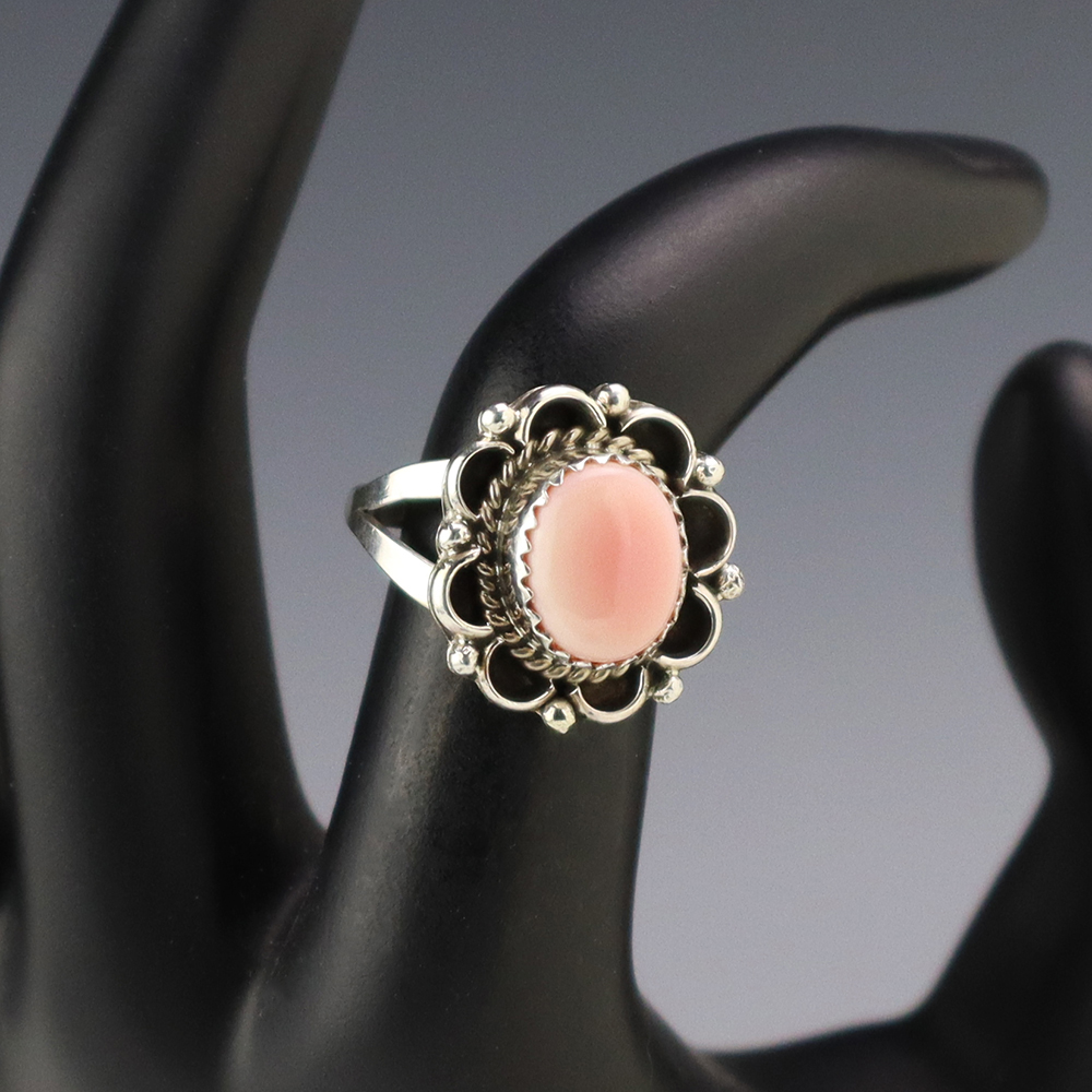 This ring is a great representation of hand made Navajo jewelry and will make a statement on your hand. Spiny Oyster is set into a sterling silver setting. Made by Navajo artist Benjamin Martinez. Weighs 6 grams. Size 6 1/4. Signed