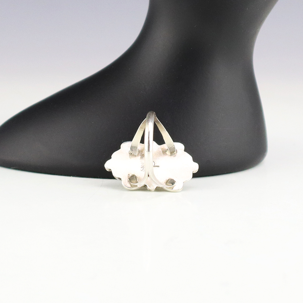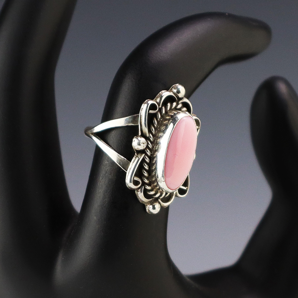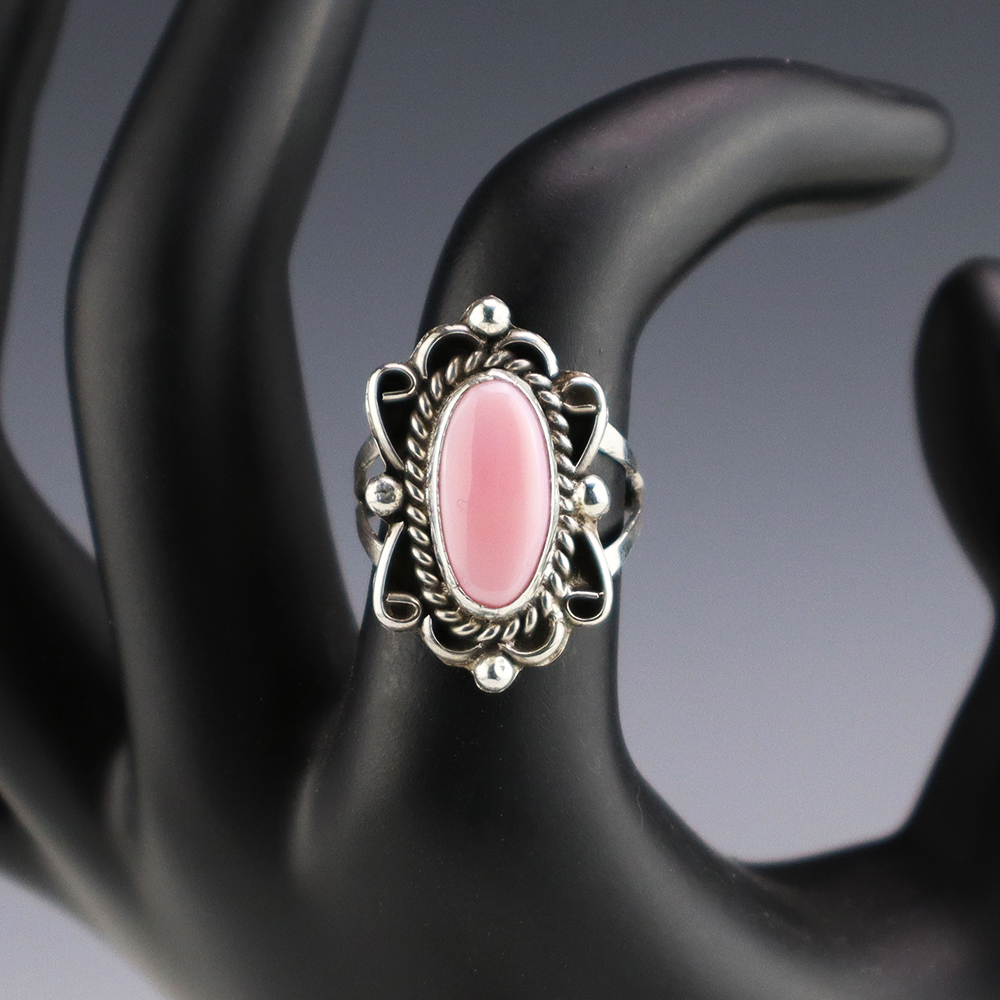 This ring is a great representation of hand made Navajo jewelry and will make a statement on your hand. Pink Conch is set into a sterling silver setting. Made by Navajo artist Priscilla Smith. Weighs 4 grams. Size 7. Signed