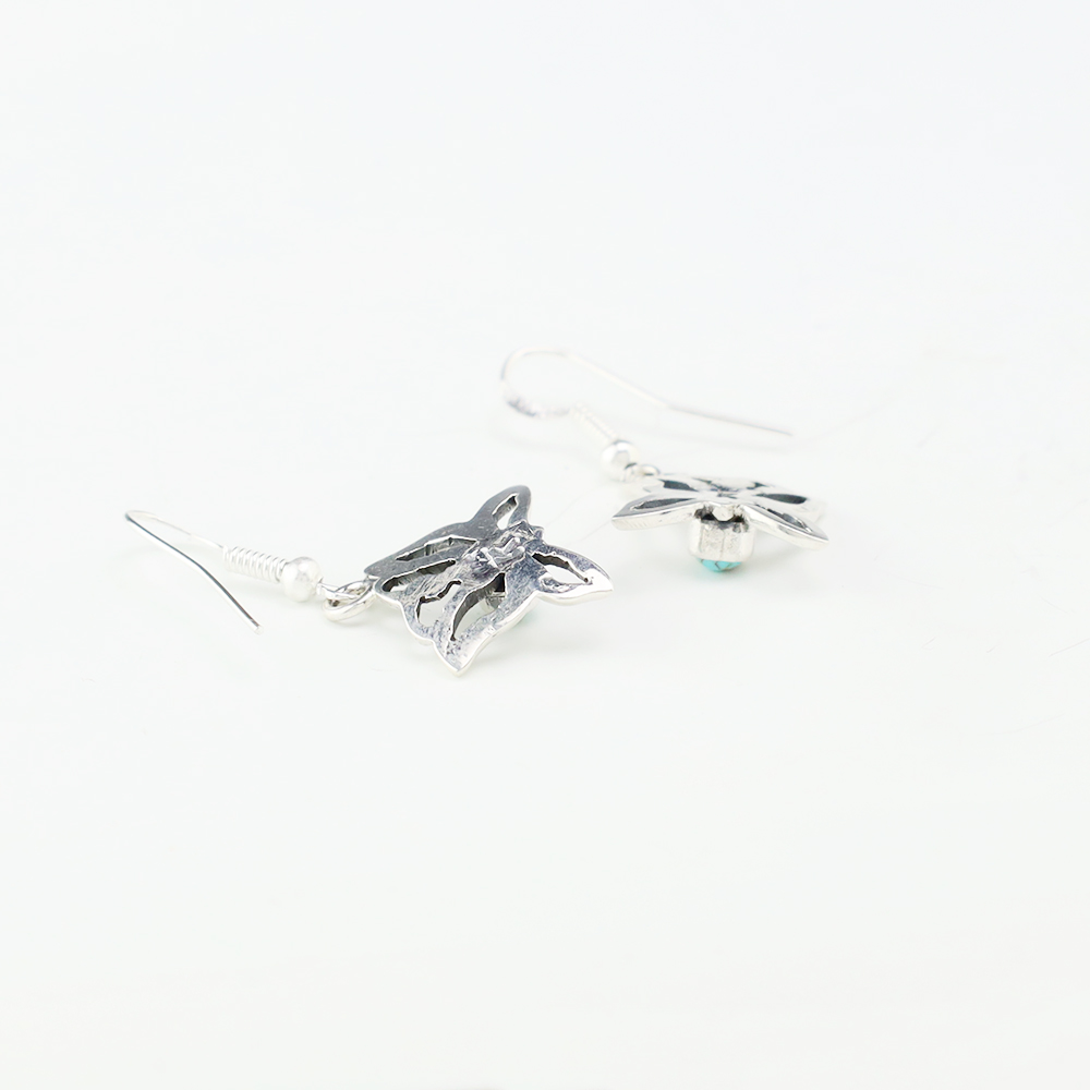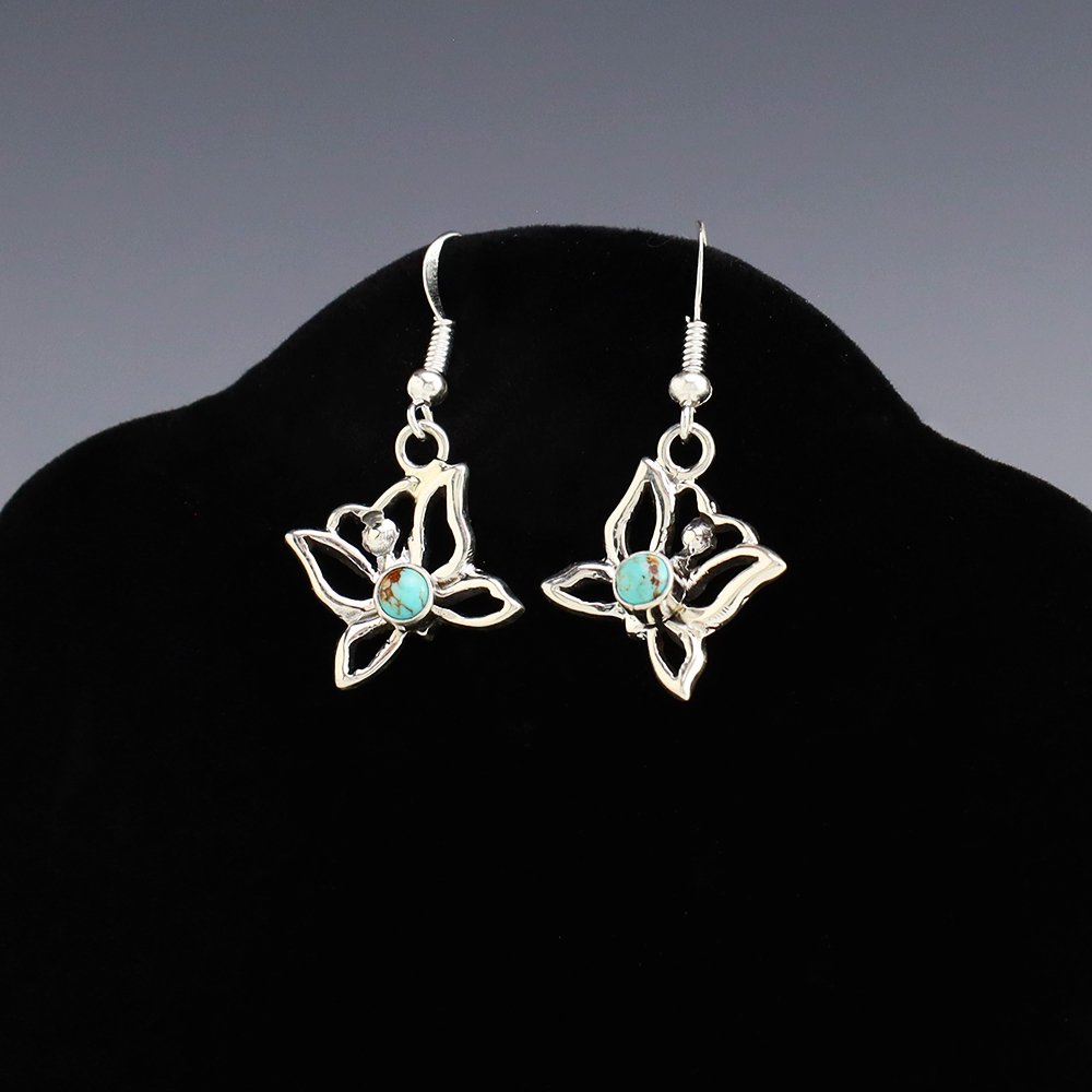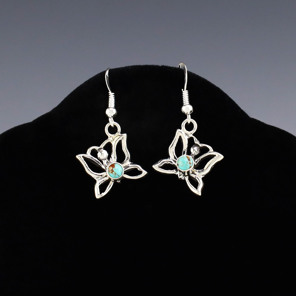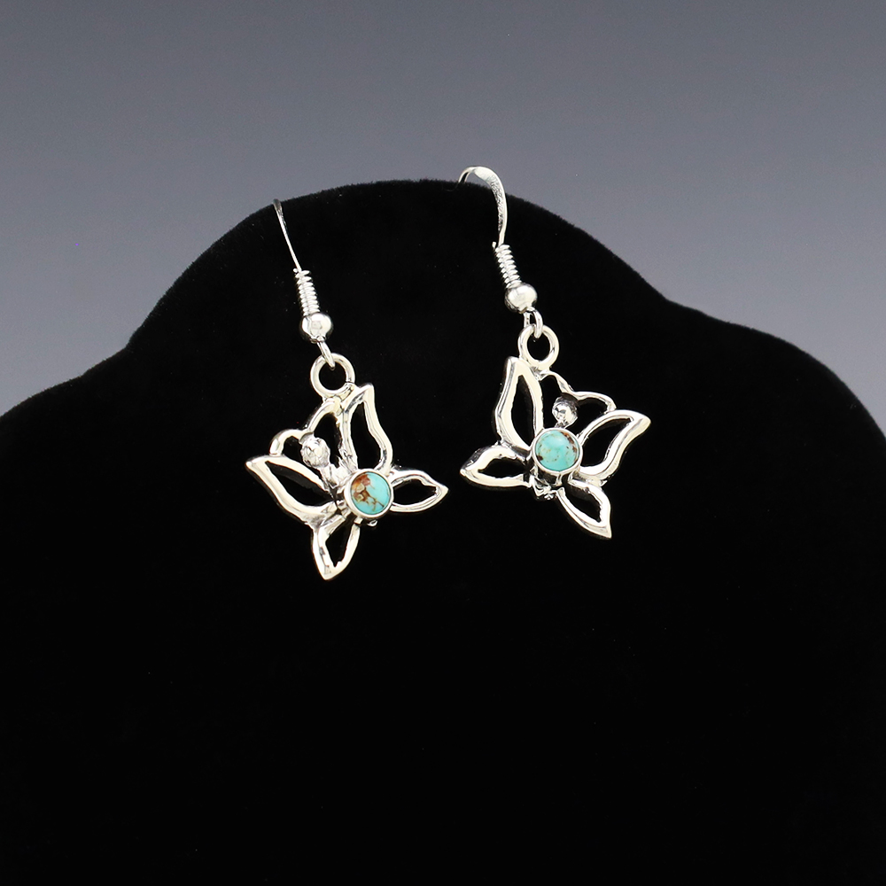 Lovely Butterfly earrings hand made out of sterling silver and Turquoise by Navajo silversmith Isabelle Kee. These wonderful earrings will become a versatile accessory in your jewelry collection. Weighs 4 grams. Signed
