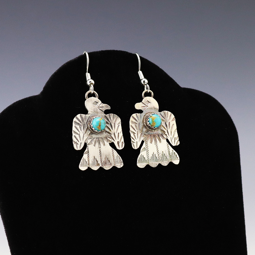 Stellar Thunderbird earrings hand made out of sterling silver and Turquoise by Navajo artist Gabrielle Yazzie. A timeless beauty that you will enjoy for years to come. Weighs 4 grams. Signed