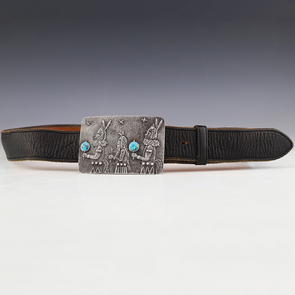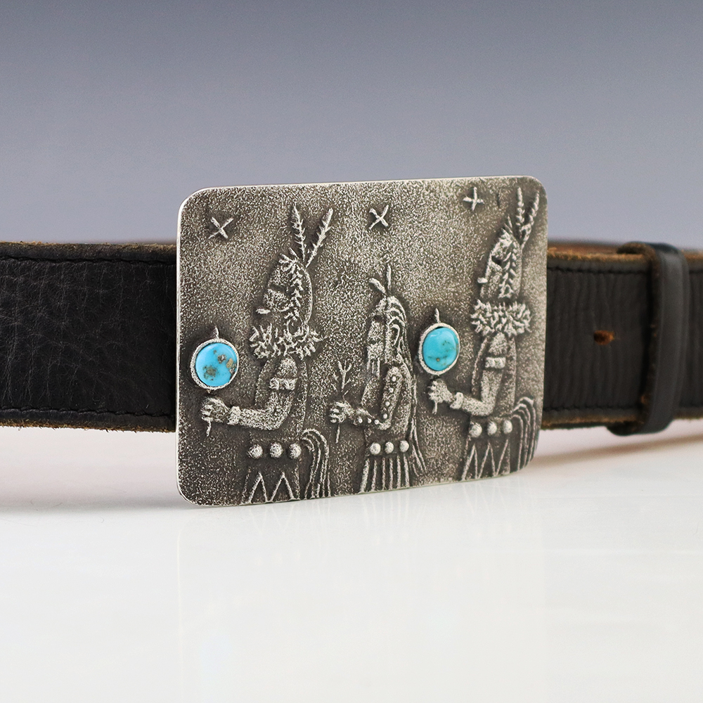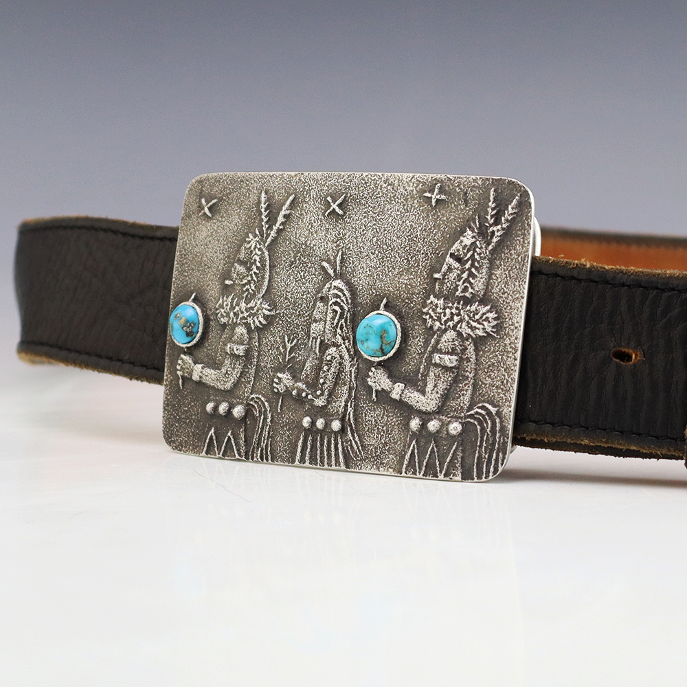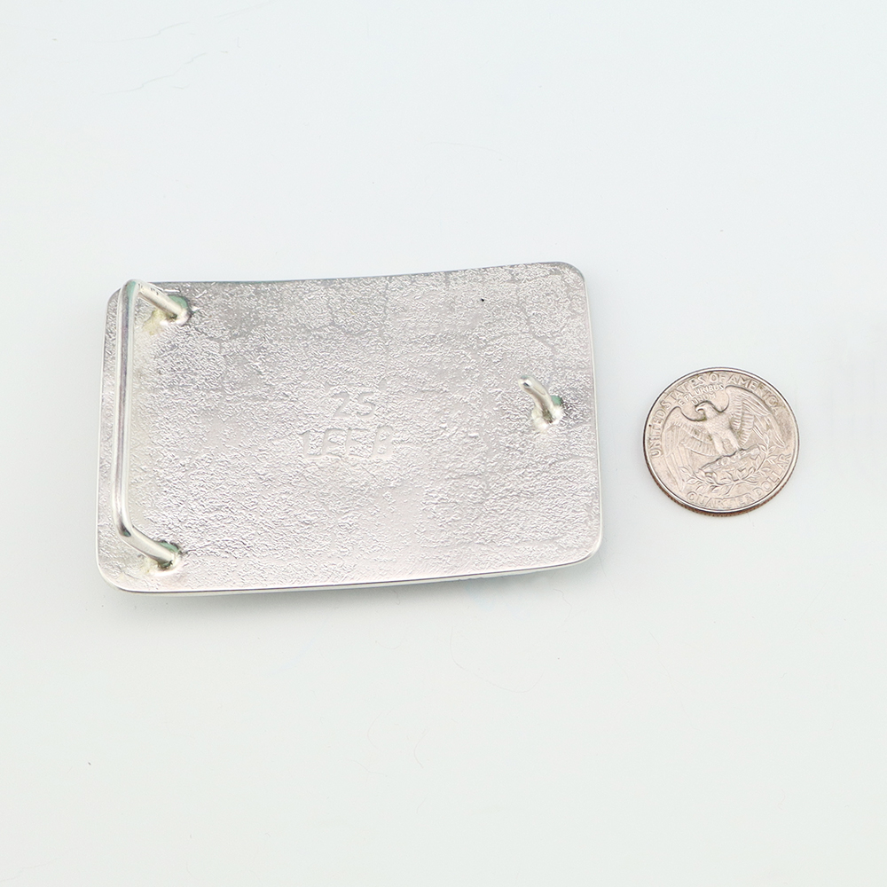 In the mid 1800s, Navajo silversmiths started to use sand casting as one of their silversmithing techniques. Today, silversmiths still use this technique by carving a design in tufa stone (a porous limestone) and then placing another stone against it. The two pieces are fastened together and molten silver is poured in. Once it has cooled, the artist takes the piece out and finishes it. Navajo artist Lee Begay made this exquisite buckle in this manner. Sterling silver and Turquoise. Fits a 1 1/2” belt. (Belt not included) Weighs 74 grams. Signed