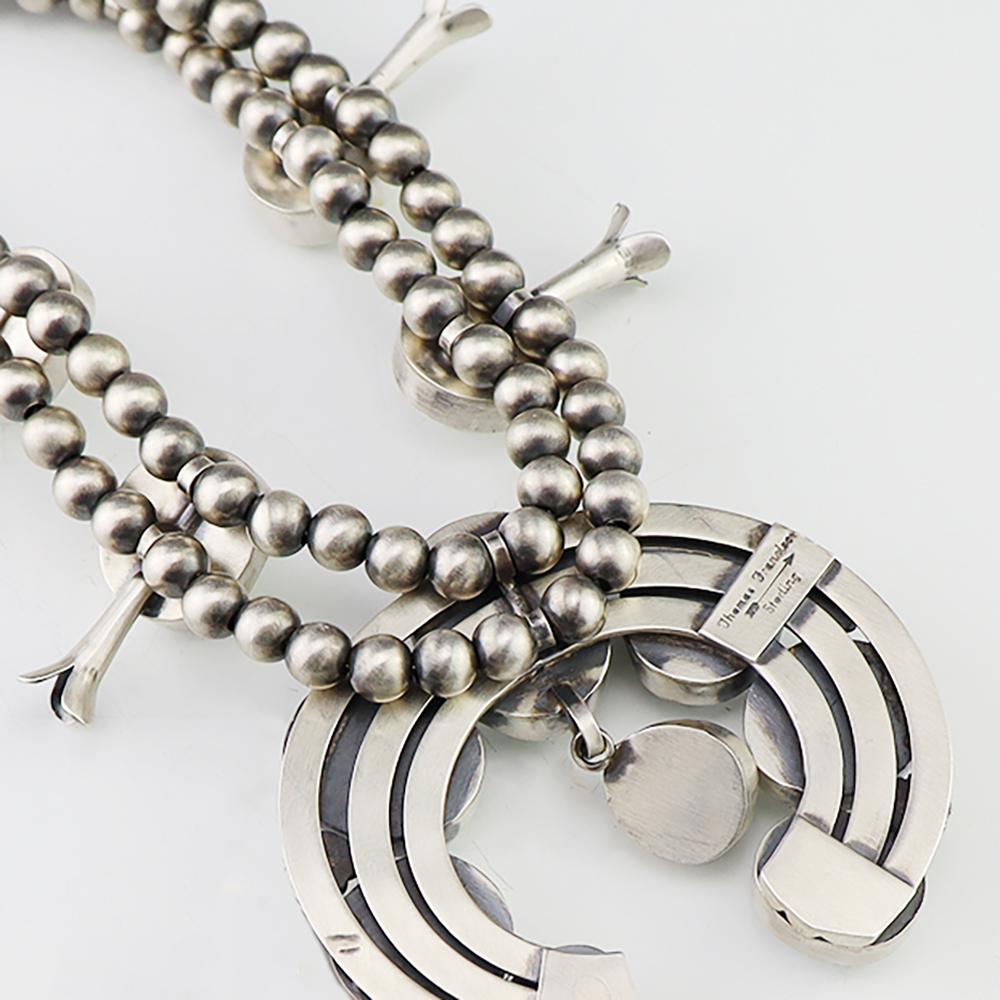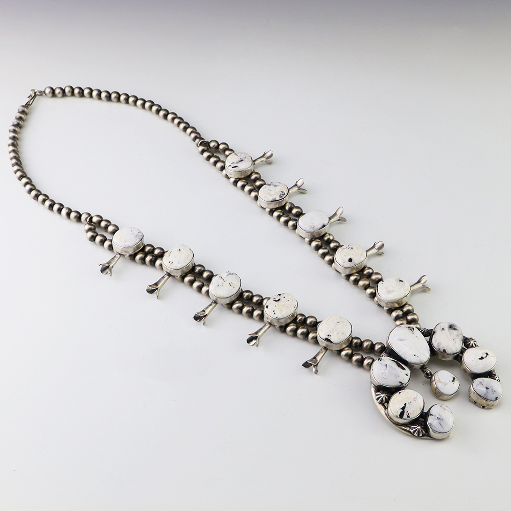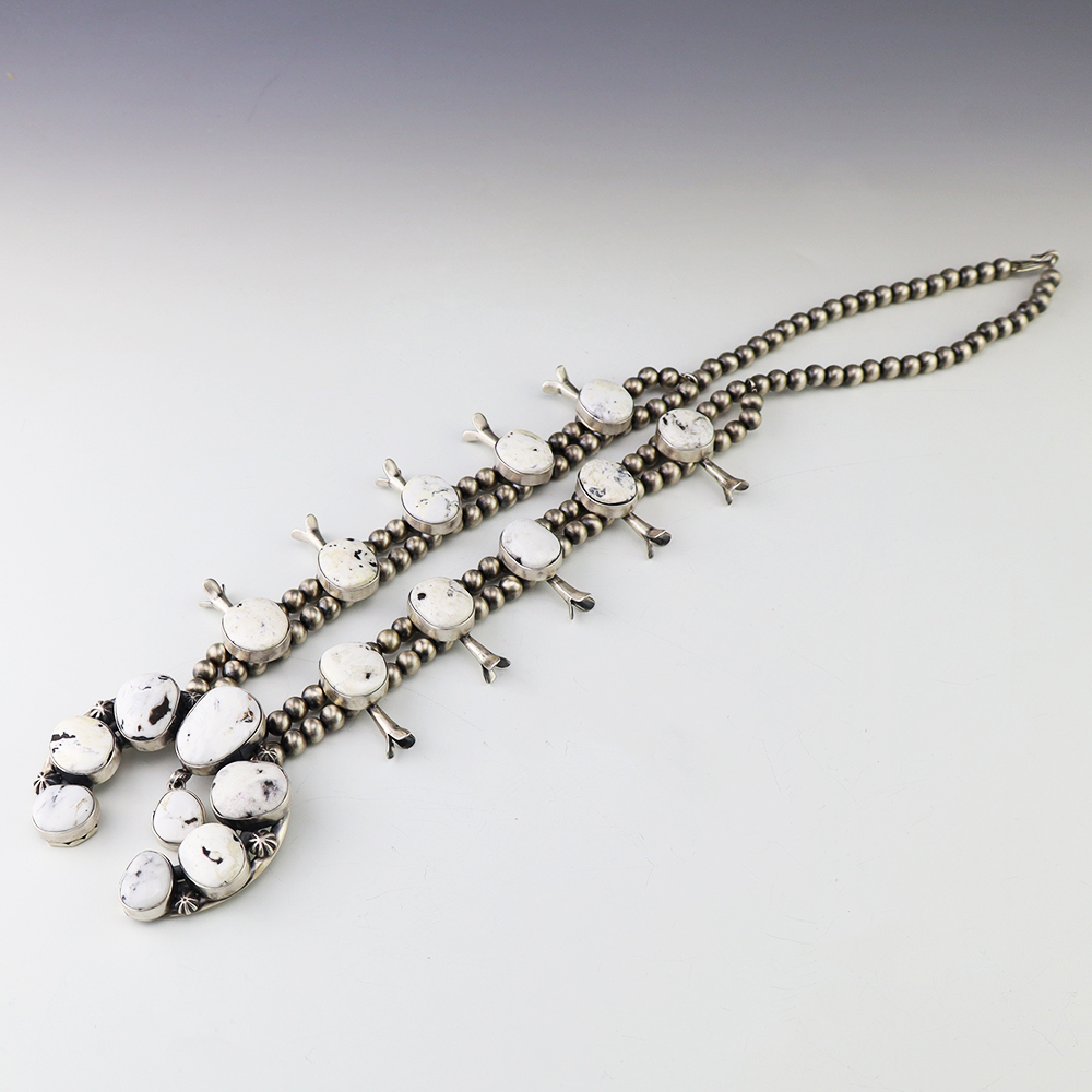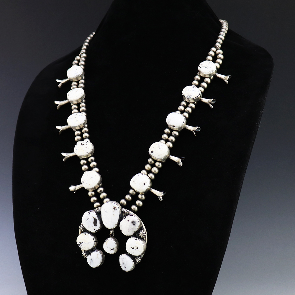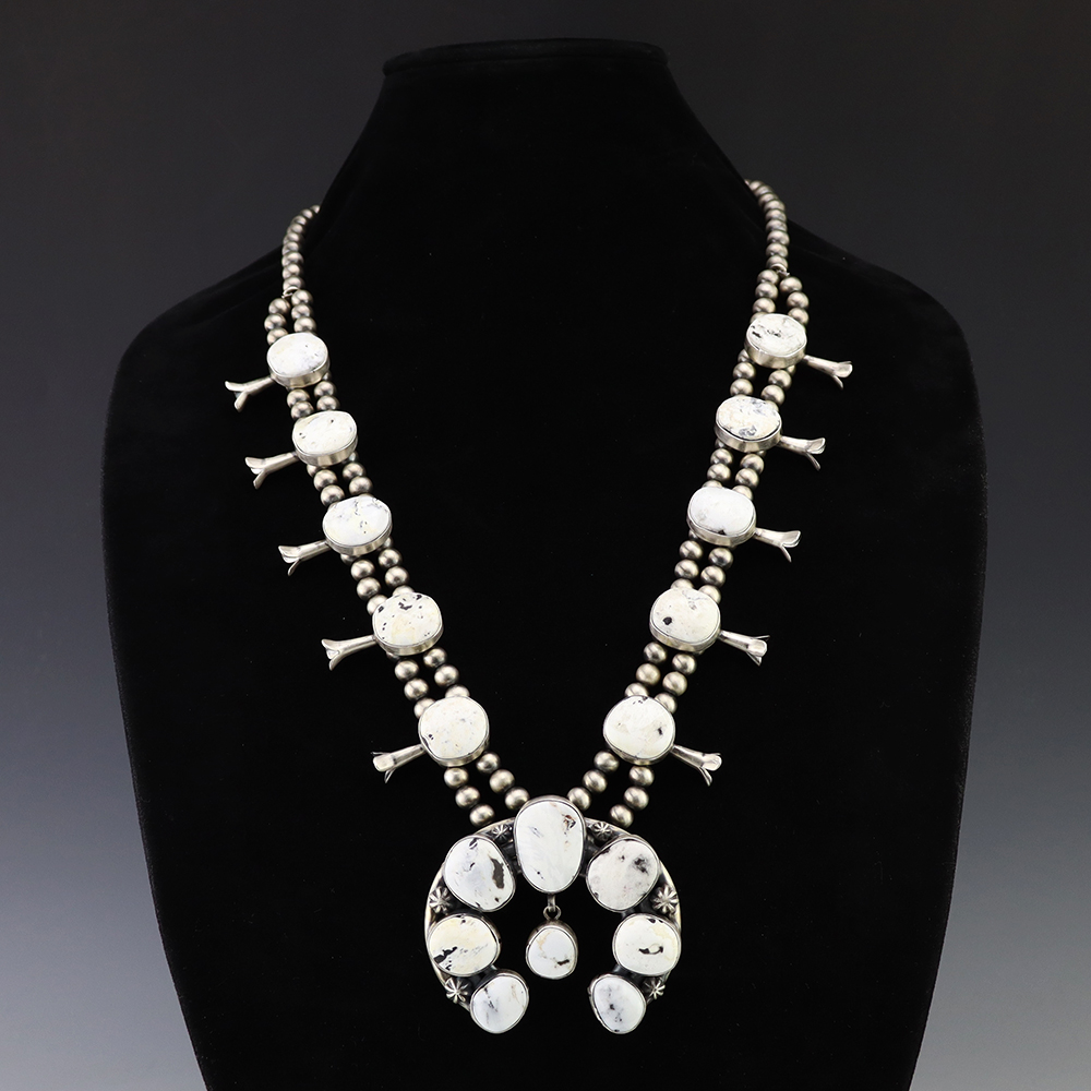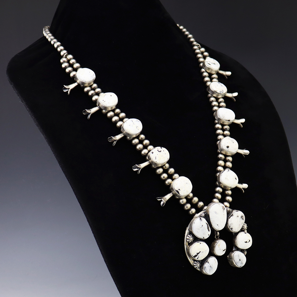 This gorgeous sterling silver squash blossom necklace was created by Navajo artist Thomas Francisco. The squash blossoms and the naja are set with White Buffalo stones. The necklace is strung with sterling silver 7 mm beads. The necklace is finished off with a sterling silver hook and eye, and the necklace has a satin finish. A timeless beauty that you will enjoy for years to come. The necklace weighs 196 grams. Signed.