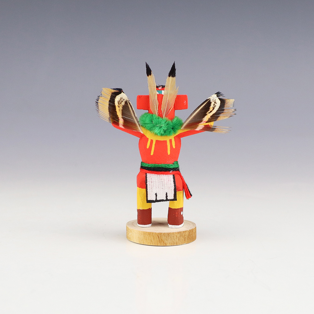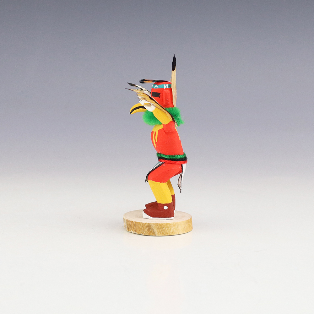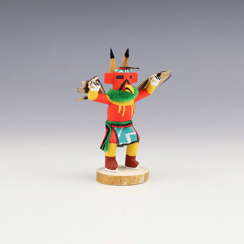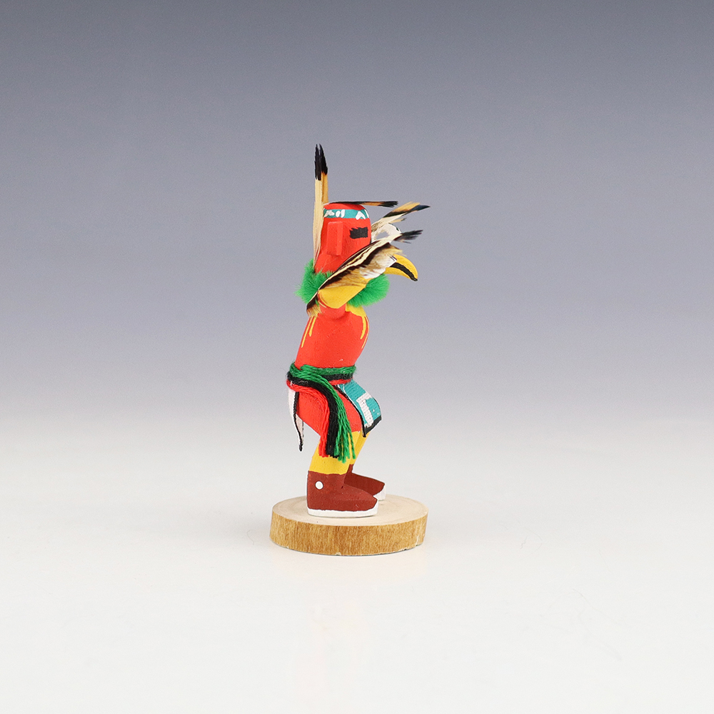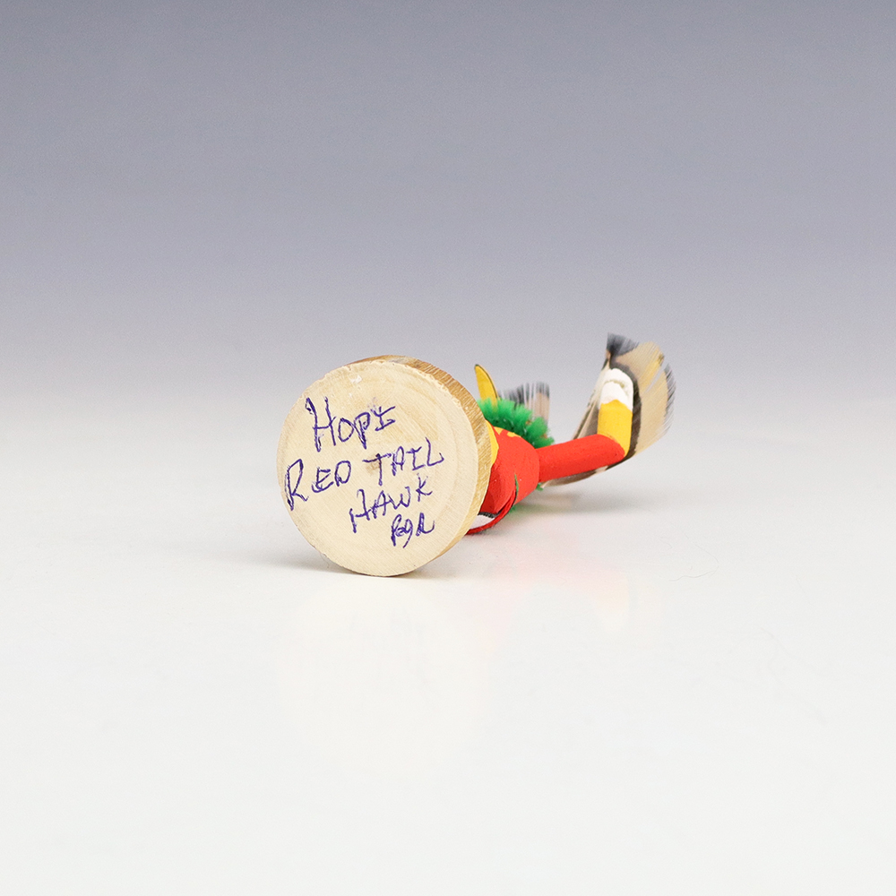 Hopi/Acoma artist Adrian Leon creates wonderful miniature kachinas, and this Red Tail Hawk Kachina is no exception. Delicately carved and painted, this marvelous carving would be a great addition to your kachina or Native American art collection. Signed
