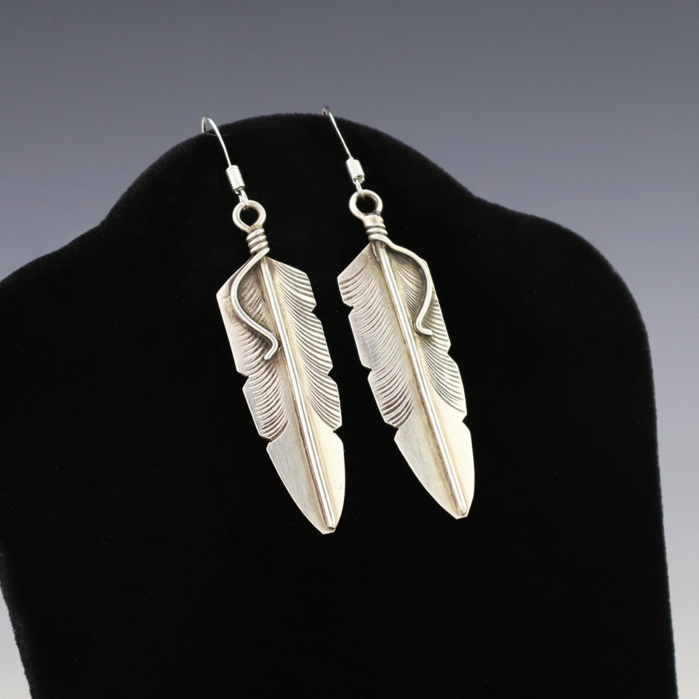 Gorgeous earrings hand made out of sterling silver and turquoise. Hand made by Navajo silversmiths Eva and Linberg Billah. These fabulous earrings will become a versatile accessory in your jewelry collection. Weighs 14 grams. Signed. 1 1/8″ x 1 3/4″ With ear wires are 2 1/4” in length. The Navajos...