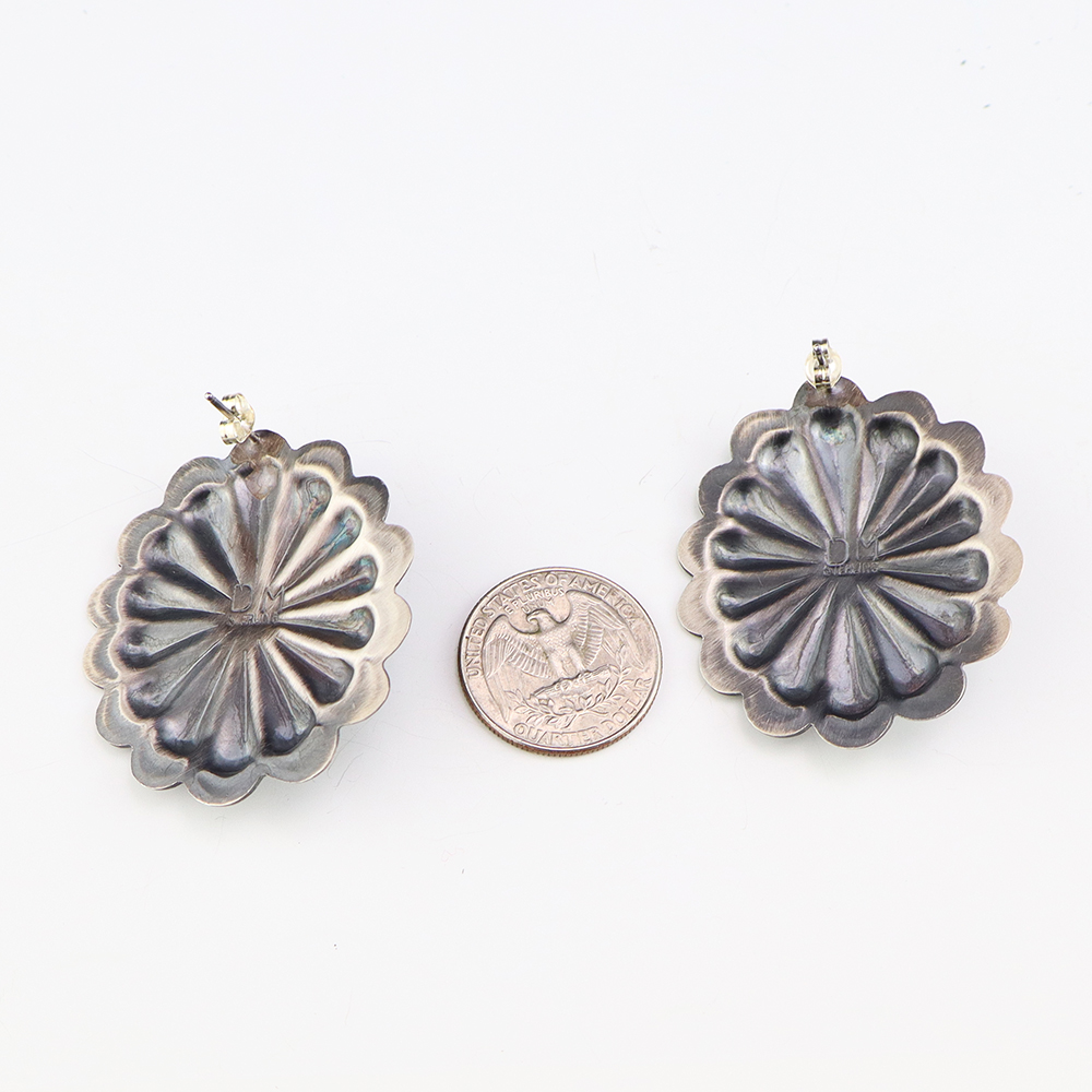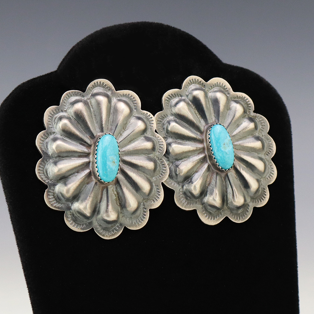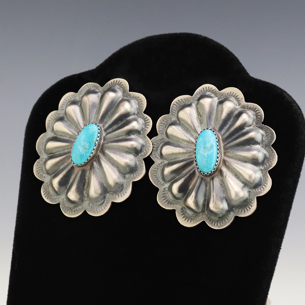 Lovely concho earrings hand made by Navajo artist Dale Morgan. The earrings are sterling silver and set with Turquoise stones. These fabulous earrings will become a versatile accessory in your jewelry collection. Weighs 22 grams. Signed.