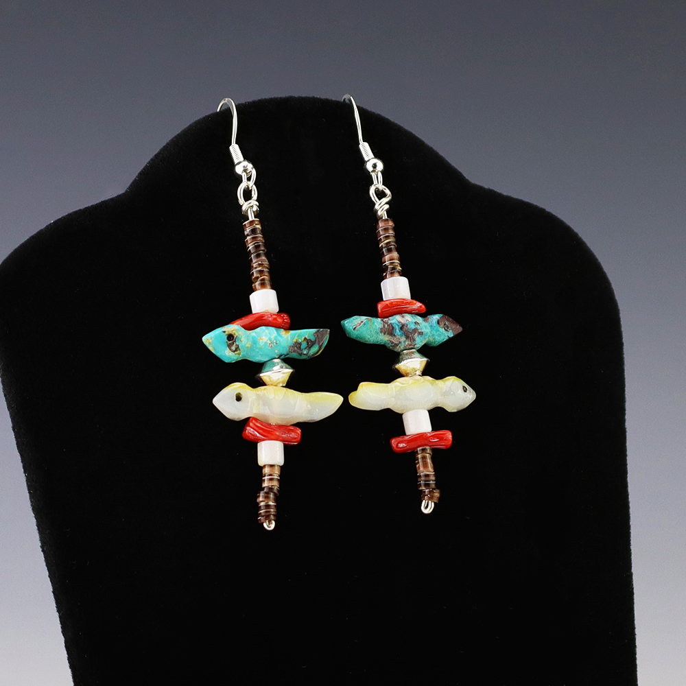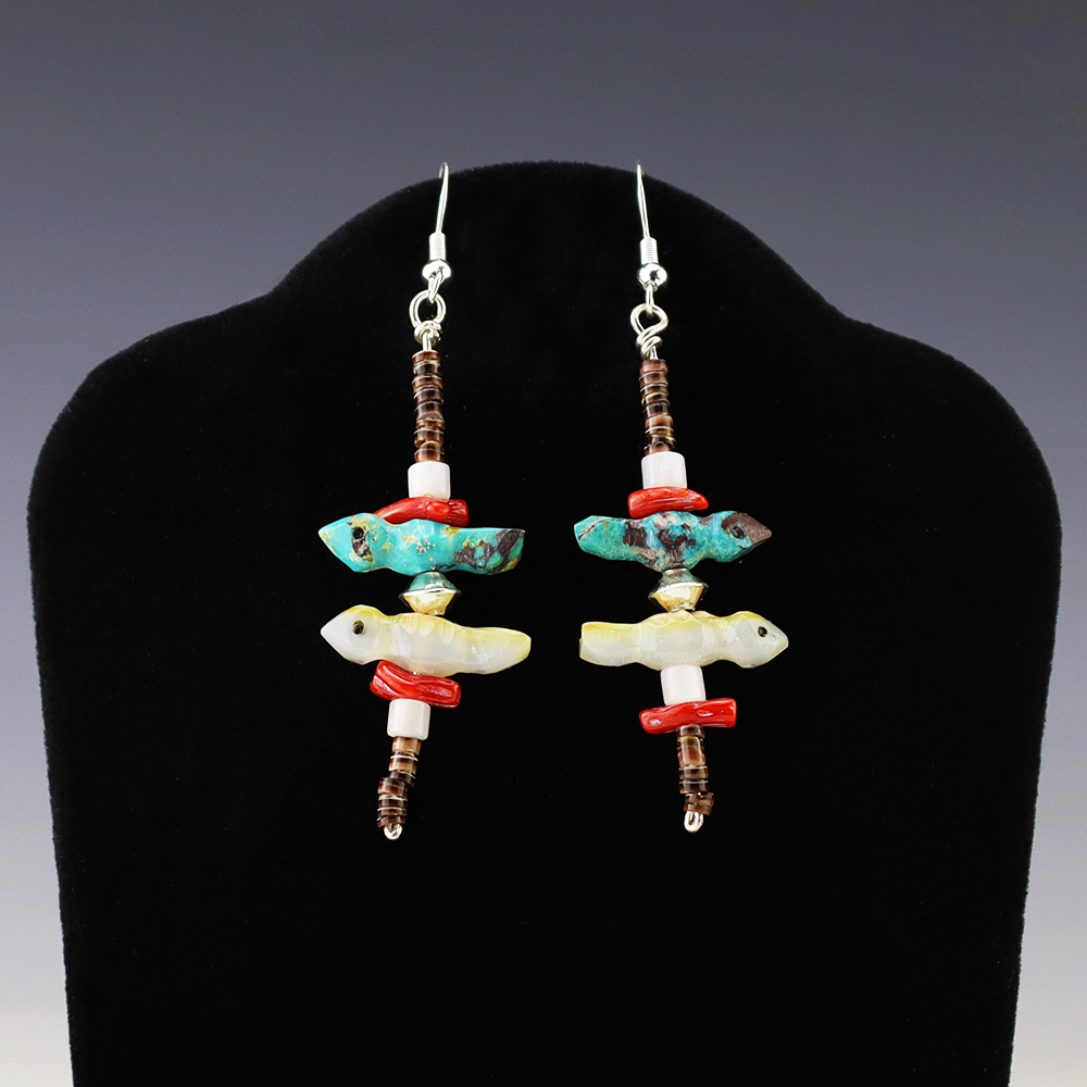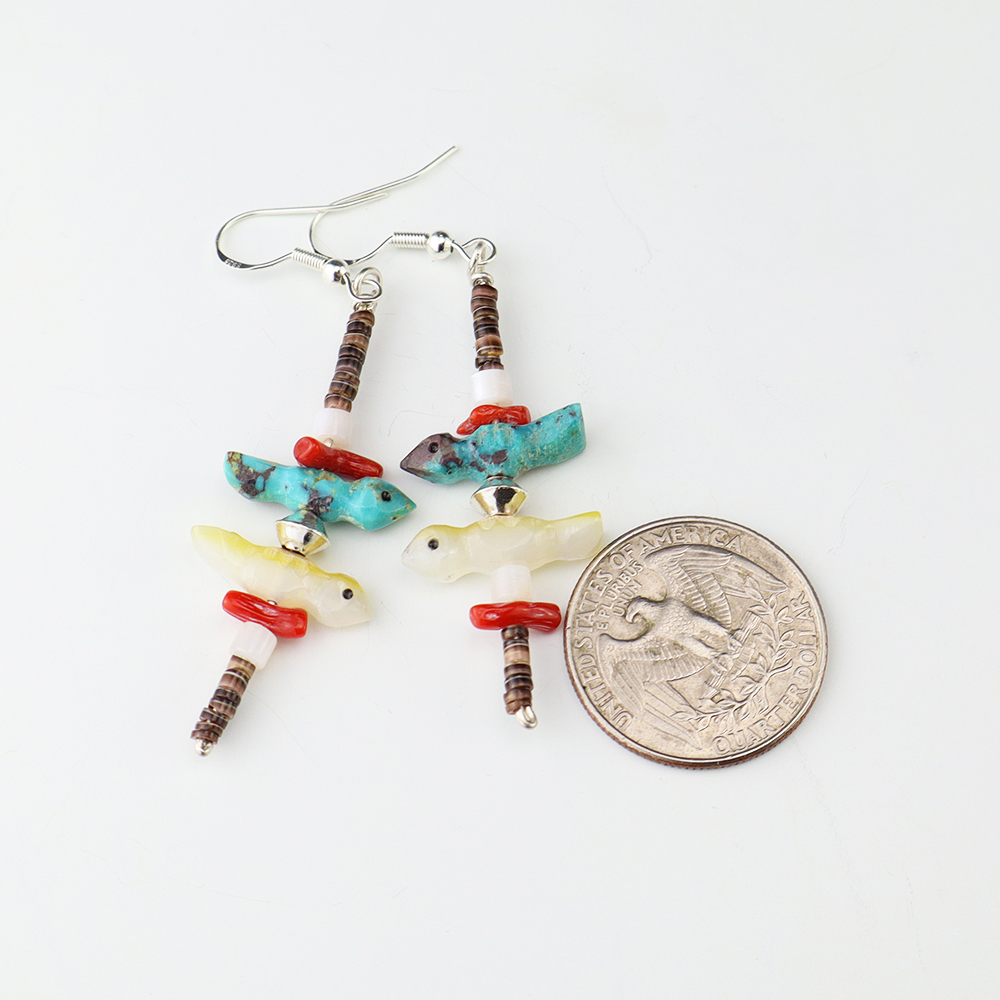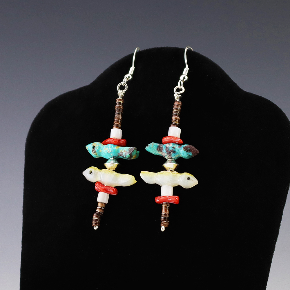 Lovely bird fetish earrings made out of Turquoise, Coral, Olive Shell, Mother of Pearl Shell, and sterling silver. Hand made by Nancy and Sheldon Westika. These earrings will become a versatile accessory in your jewelry collection. Weighs 6 grams.