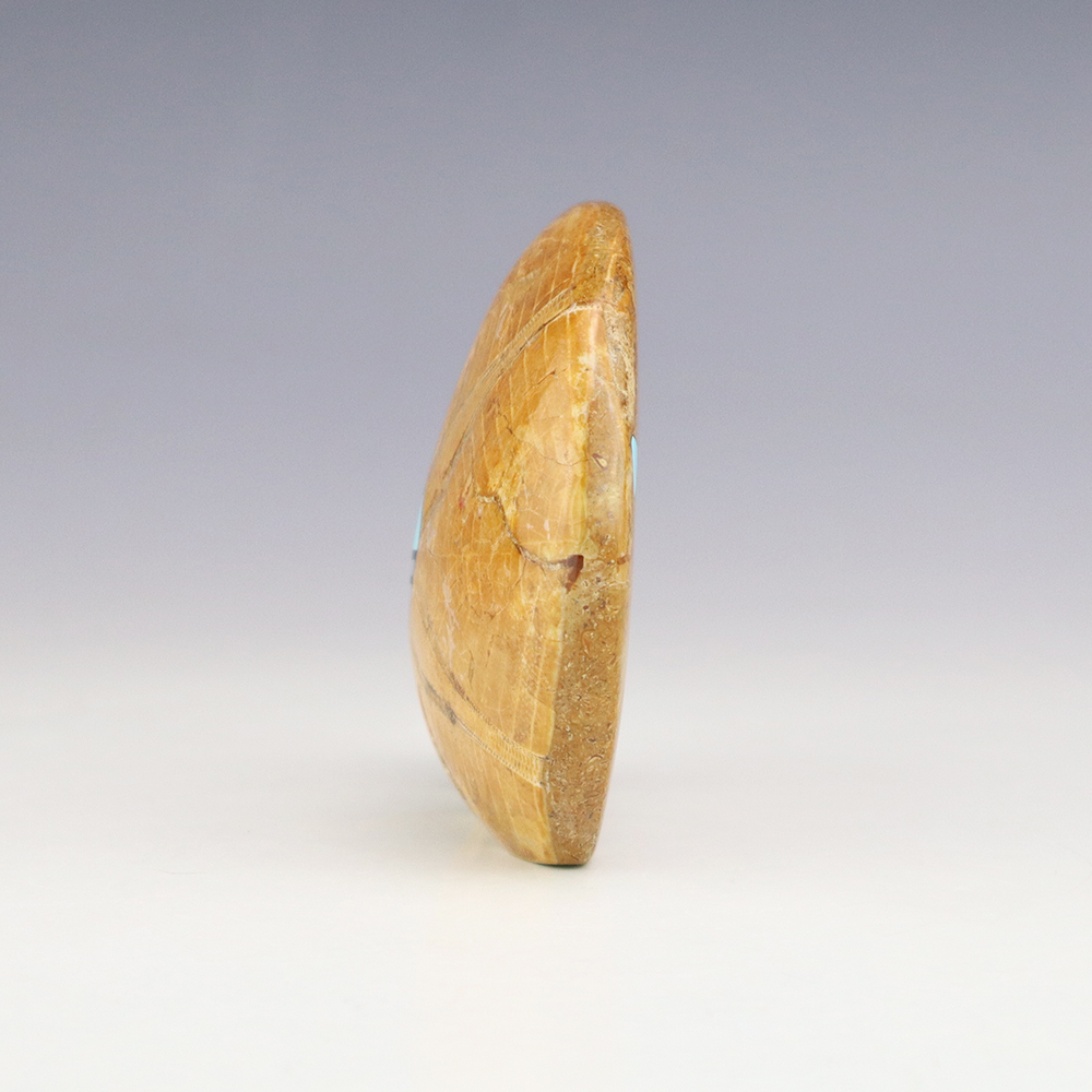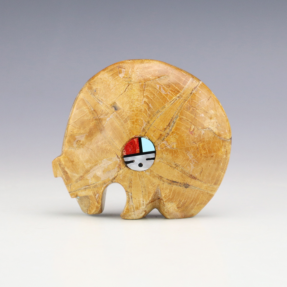 Zuni bear fetishes represent healing and strength. Zuni artist Kenric Laiwakete hand crafted this exquisite bear fetish. The bear carving is made out of Madagascar Sea Urchin Fossil. One side has an inlaid Turquoise heartline, and the other side has an inlaid Sun Face made out of Turquoise, Coral, Mother of Pearl Shell, and Jet. This great carving would make a great addition to your Native American art or Zuni fetish collection. Signed (note-there is natural fracturing in the urchin)