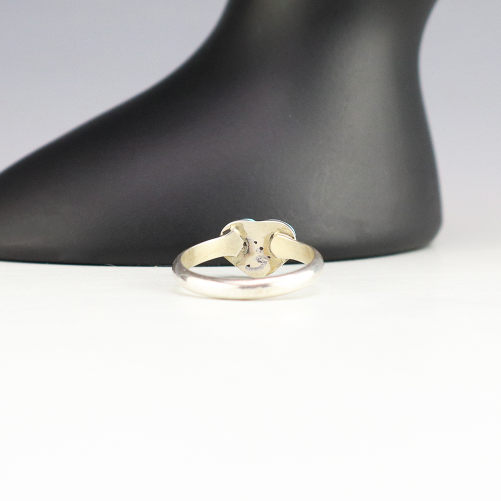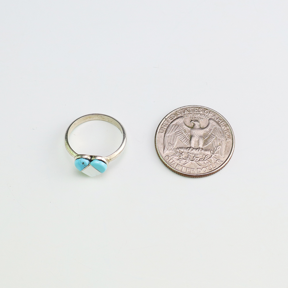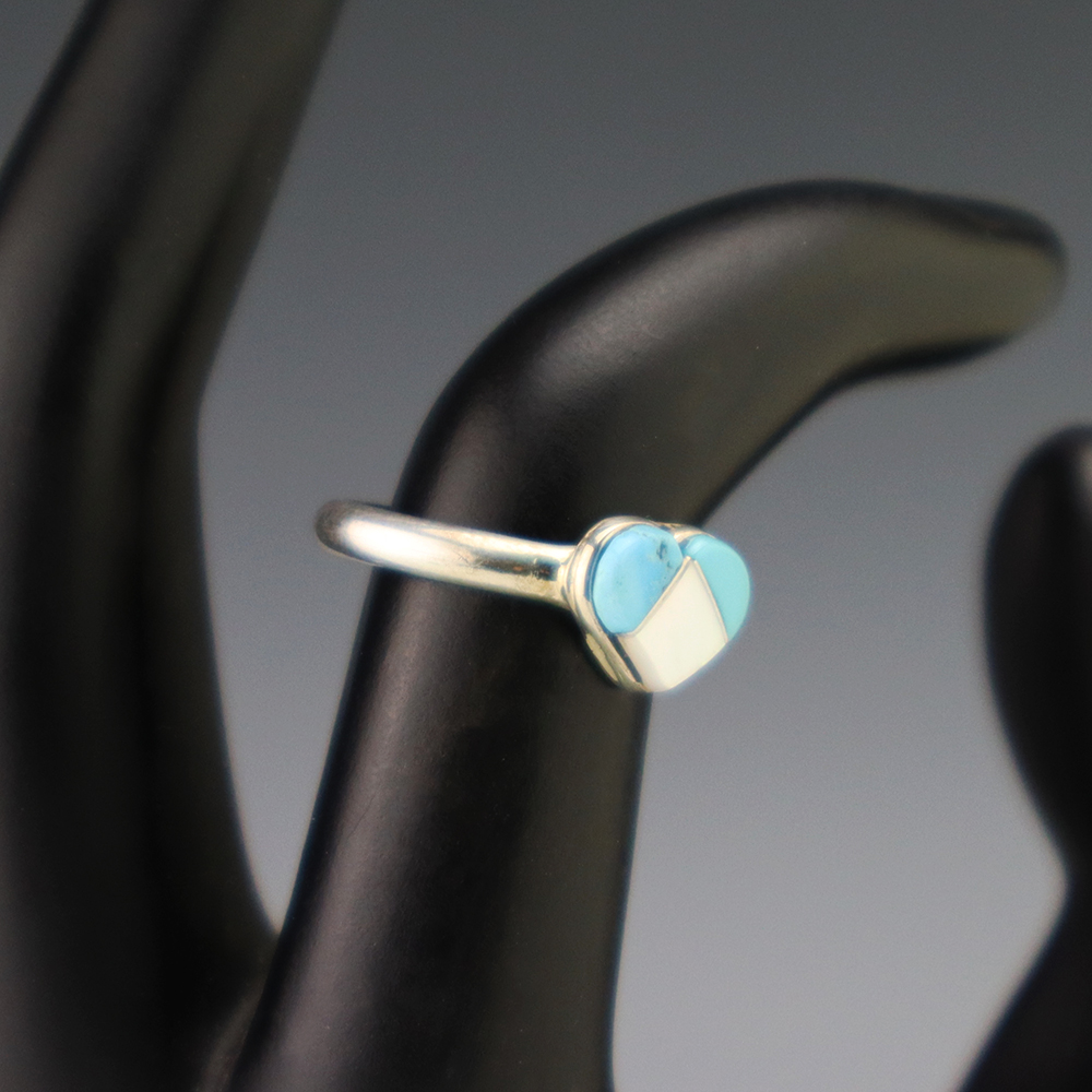 Zuni artists are known for their fine lapidary skills. Each stone is hand cut, polished, and set into a sterling silver setting. The ring is set with Mother of Pearl Shell and Turquoise stones. Hand made by Zuni artist Linda Chavez. Weighs 2 grams. Size 5 3/4.
