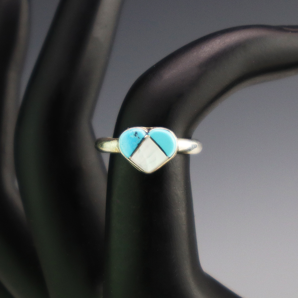 Zuni artists are known for their fine lapidary skills. Each stone is hand cut, polished, and set into a sterling silver setting. The ring is set with Mother of Pearl Shell and Turquoise stones. Hand made by Zuni artist Linda Chavez. Weighs 2 grams. Size 5 3/4.