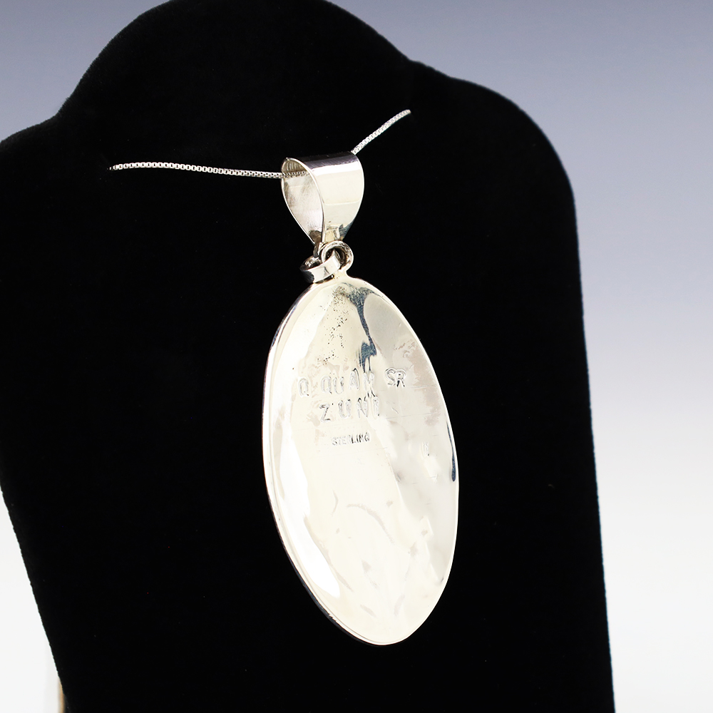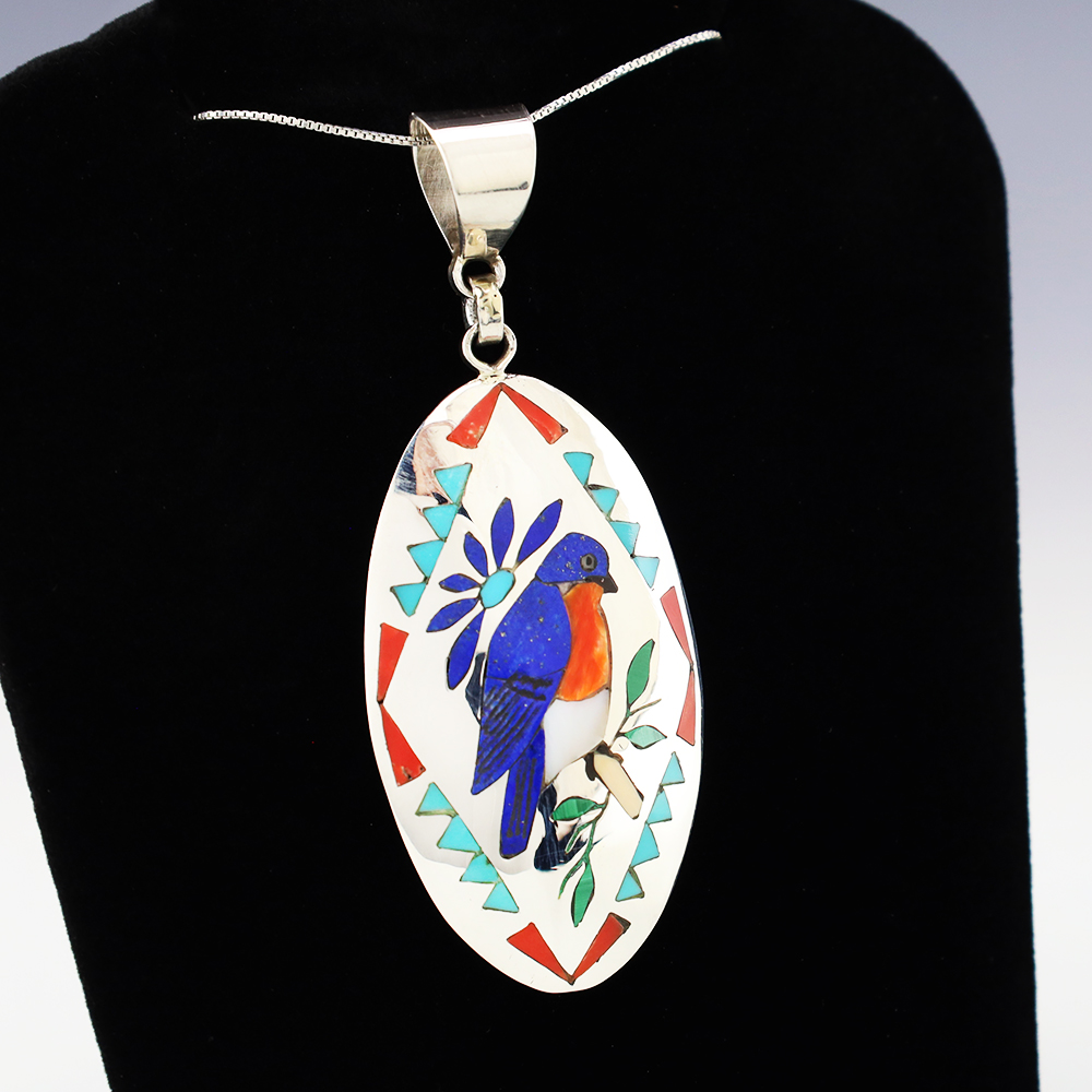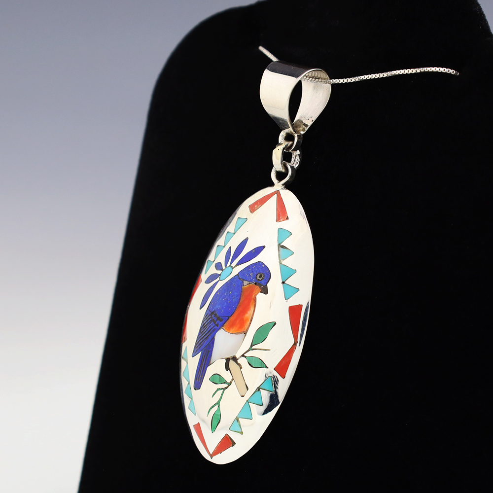 Zuni artist Quintin Quam hand made this exquisite pendant depicting an Eastern Blue Bird. The sterling silver pendant is intricately inlaid with Turquoise, Lapis, Jet, Melon Shell, Spiny Oyster, Coral, Malachite, and Mother of Pearl Shell. Quintin domed this pendant, giving it a great shape. Amazing detail! Weighs 16 grams. (Chain not included) Signed