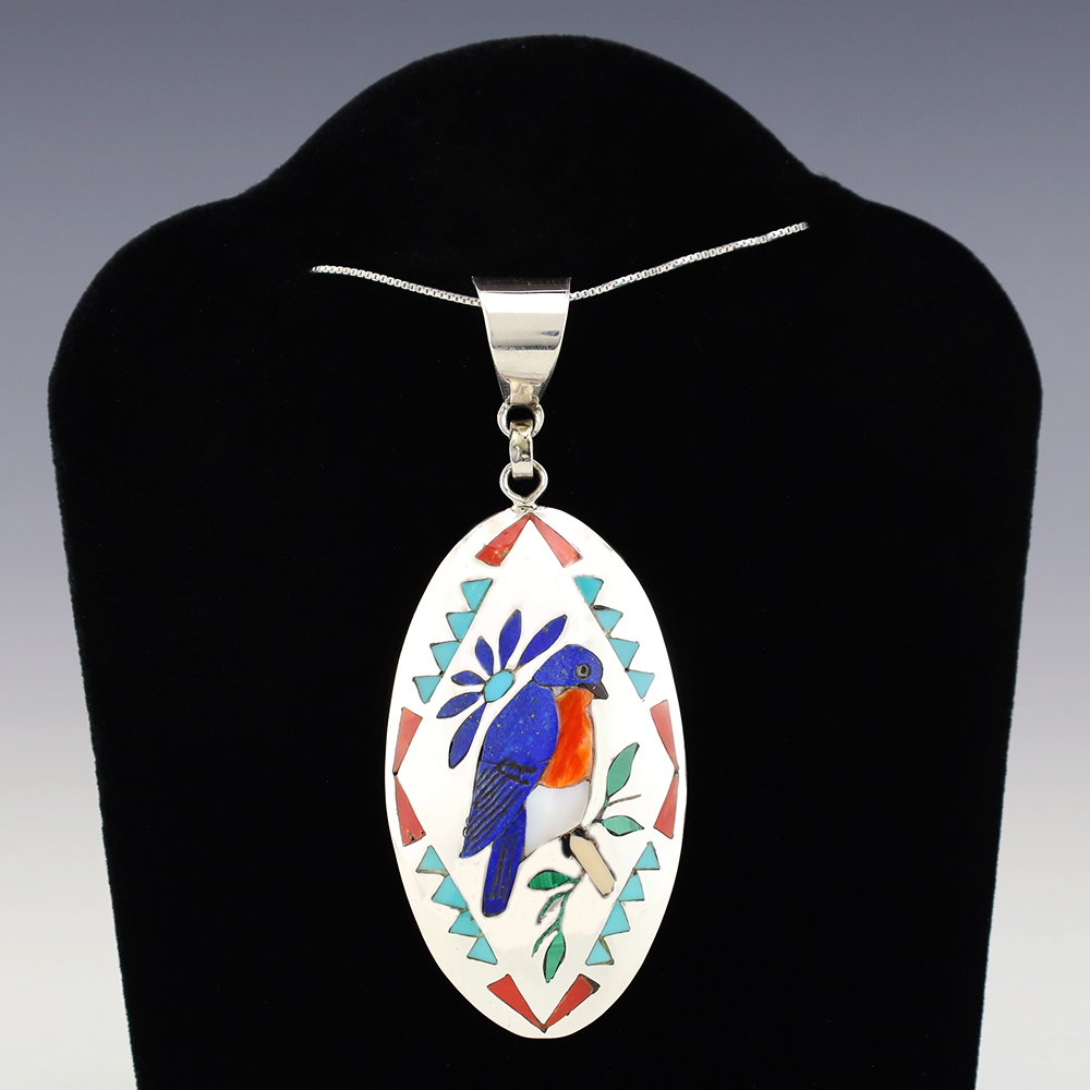 Zuni artist Quintin Quam hand made this exquisite pendant depicting an Eastern Blue Bird. The sterling silver pendant is intricately inlaid with Turquoise, Lapis, Jet, Melon Shell, Spiny Oyster, Coral, Malachite, and Mother of Pearl Shell. Quintin domed this pendant, giving it a great shape. Amazing detail! Weighs 16 grams. (Chain not included) Signed